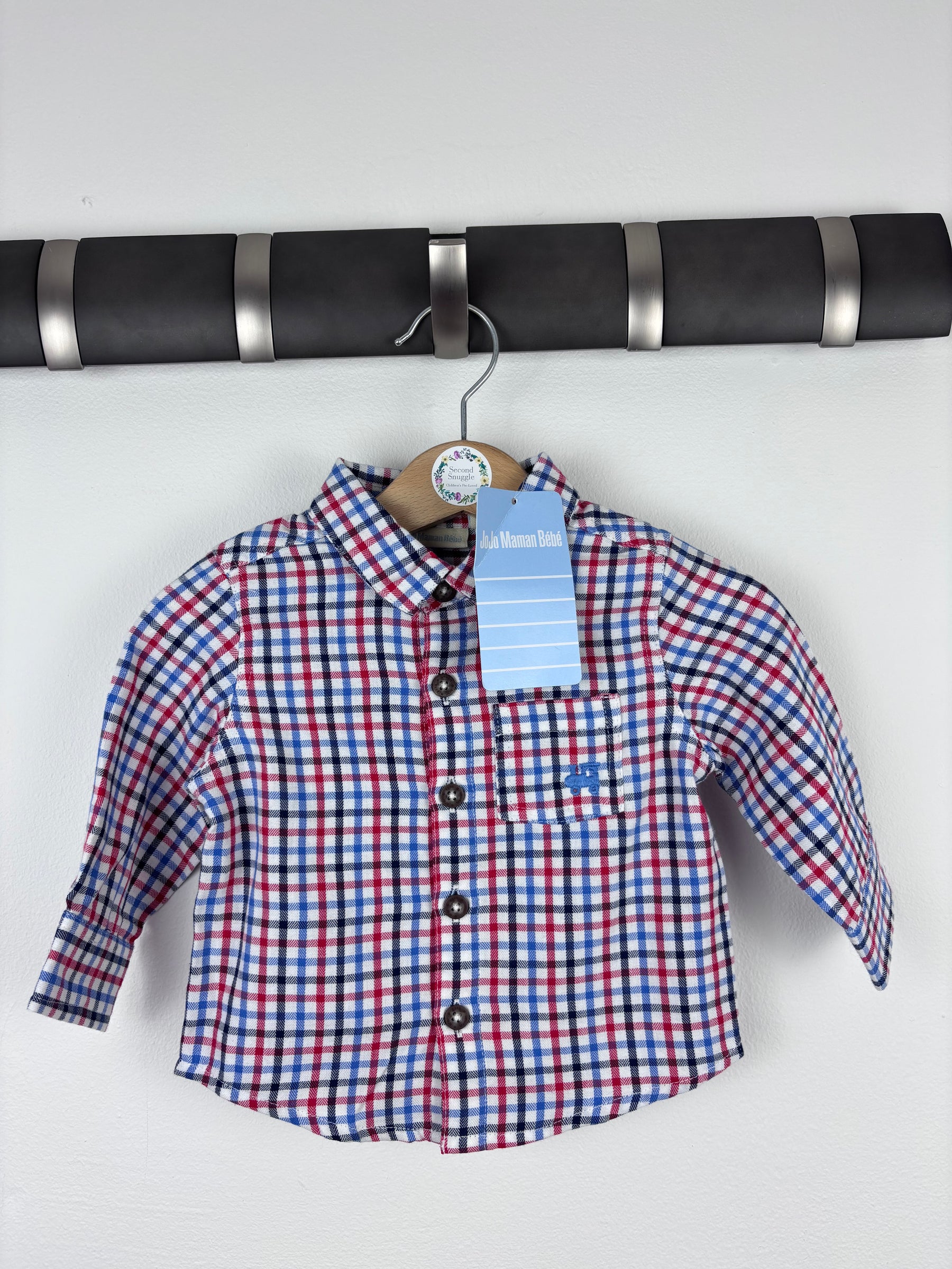 This JoJo Maman Bébé check shirt is new with tags and made from soft brushed cotton. The red, blue and white check gives a timeless look, finished with wooden style buttons and a chest pocket for added detail. Long sleeves and a relaxed fit make it easy to layer over a vest or under knitwear. Ideal for smarter days while still being practical for babies. This is a second hand item in unworn condition. A preloved JoJo Maman Bébé piece that feels classic and well made.