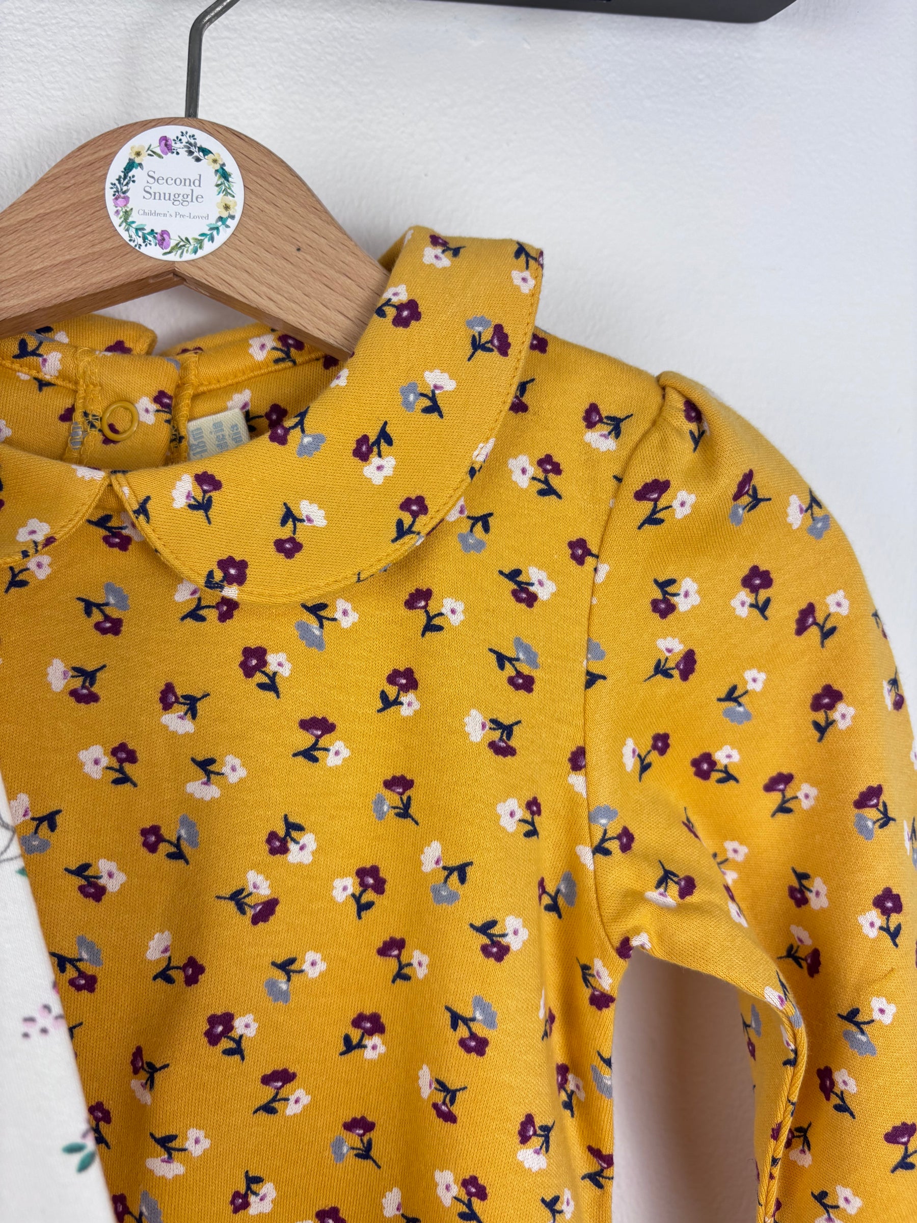 This sweet set of JoJo Maman Bébé long sleeve bodysuits comes in assorted sizes, making them a lovely addition to any baby wardrobe. Designed with a classic Peter Pan collar, they are perfect for layering under dungarees, cardigans, or worn on their own. The set includes one in crisp white with playful bunny and flower prints, and another in mustard yellow with a cheerful floral pattern. Practical popper fastenings make changes easy. A great example of second hand baby clothing, these preloved bodysuits bring comfort, quality, and sustainable children’s fashion together beautifully.