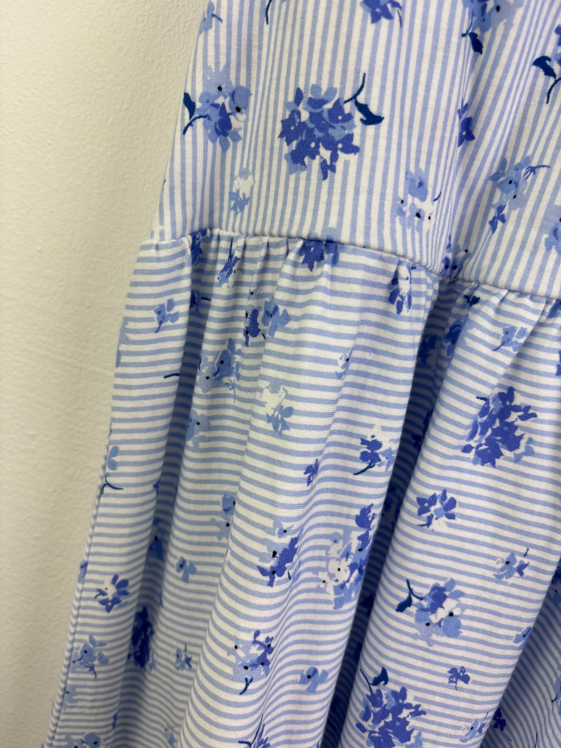Sleeveless summer dress in a fresh blue and white stripe design with scattered blue floral print throughout. Designed with a gently fitted bodice and tiered skirt hem for added movement and shape. The lightweight cotton fabric makes it breathable and comfortable, ideal for warmer days, holidays or everyday wear. The classic Joules print gives it a timeless countryside feel while remaining playful and practical. In excellent preloved condition with minimal signs of wear. A lovely easy to style piece that pairs perfectly with sandals or trainers.