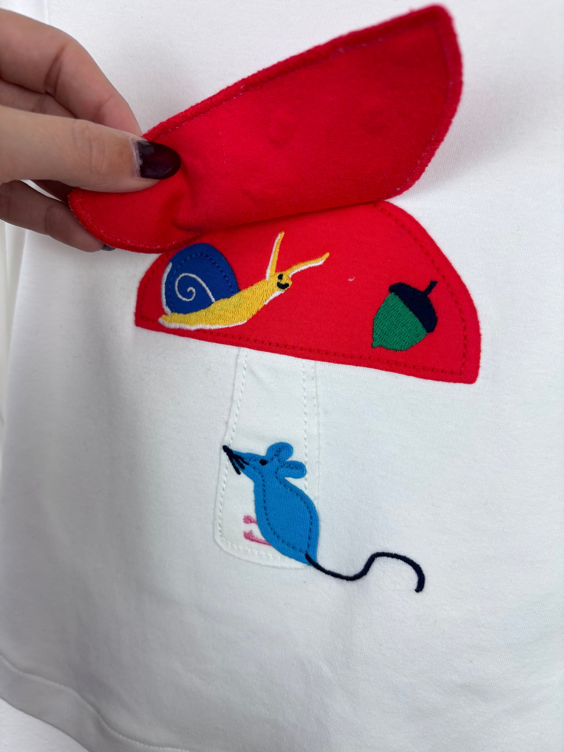 This sweet Joules top is made from soft white cotton and features a fun red toadstool appliqué with a little blue mouse peeking out beneath it. Button details on the shoulders make dressing simple, while long sleeves keep little ones warm. It’s full of Joules charm and perfect for playtime or layering with dungarees. In excellent condition, this preloved Joules piece is a delightful second hand find that adds a playful touch to every outfit.