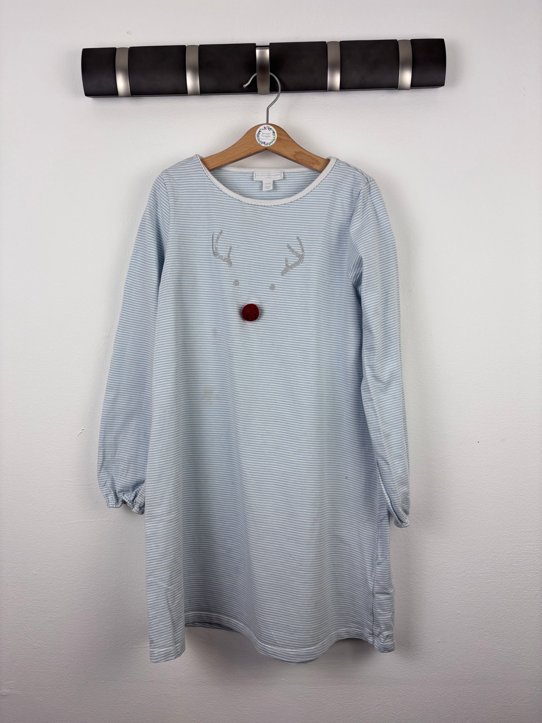 This sweet nightdress from The Little White Company is crafted from soft cotton with pale blue and white stripes. It features a simple reindeer face design with embroidered antlers and a 3D red pom-pom nose for a touch of festive charm. With long sleeves and elasticated cuffs, it’s ideal for cosy winter nights. Light marks make it perfect as playwear or for relaxed evenings at home. This preloved nightdress is still a lovely second hand piece, offering comfort, quality, and the gentle, timeless style the brand is known for.