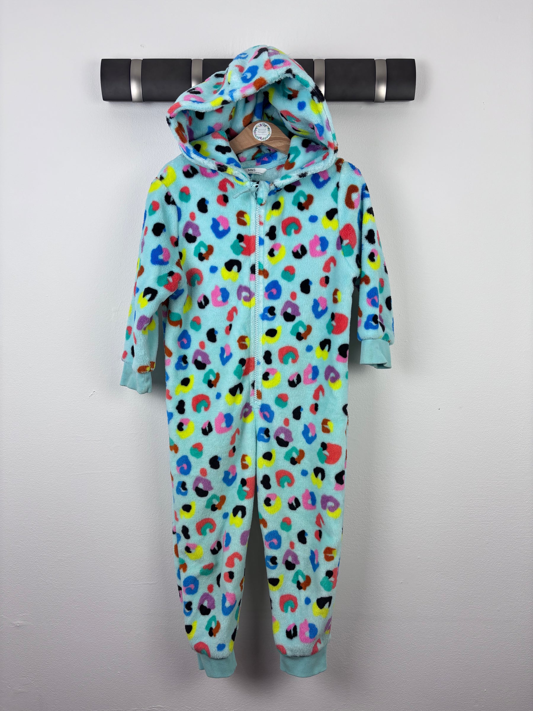 This bright and cheerful onesie from M&S features a rainbow leopard print on a soft aqua blue background. Made from plush fleece fabric, it’s super cosy for bedtime or lazy mornings. The zip-up front makes dressing quick and simple, while the ribbed cuffs at the wrists and ankles keep warmth in. Ideal for keeping little ones snug through colder months. This preloved M&S onesie is a fun second hand find that brings colour and comfort to sleepwear. Perfect for children who love bold prints and cosy nights at home.