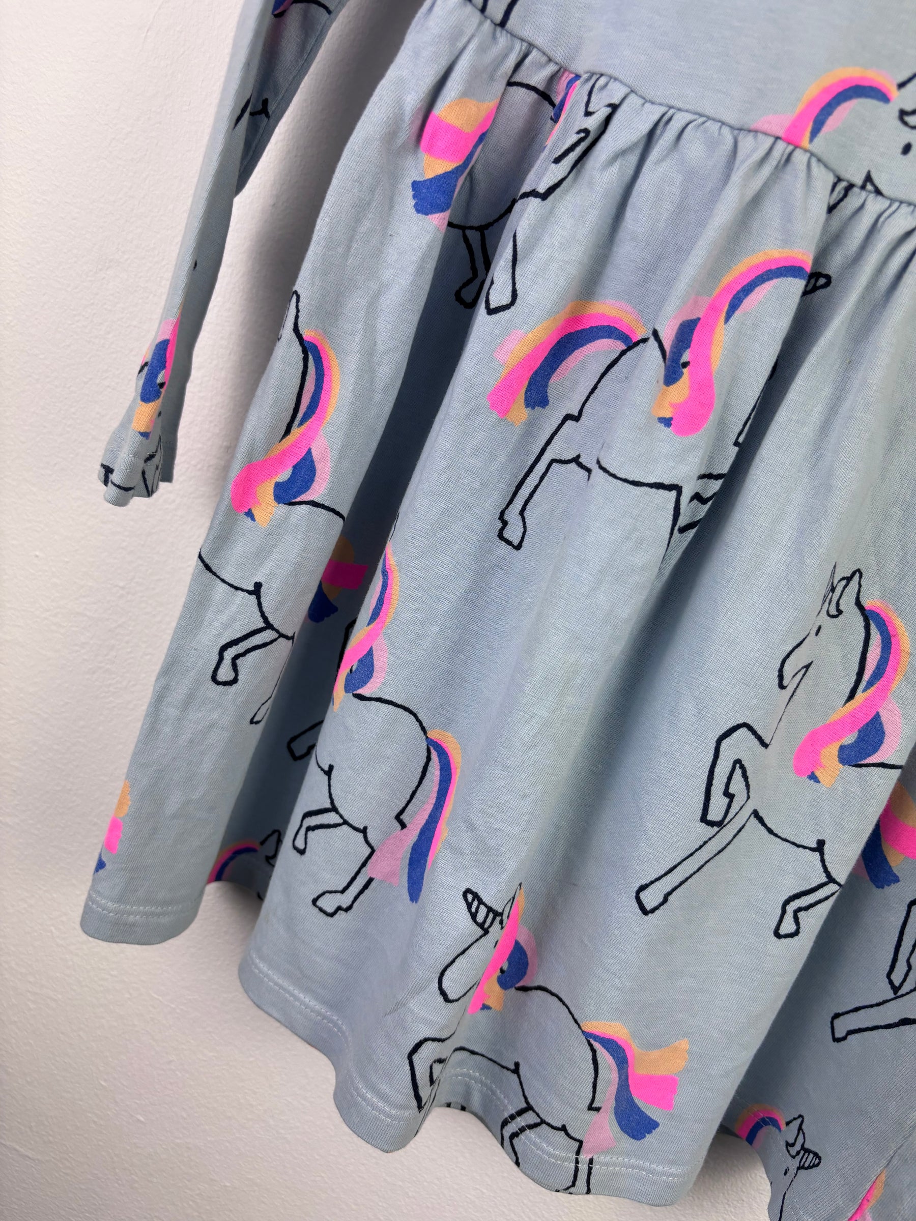 This M&S long sleeve top features a soft neutral base with an all-over unicorn print in bright, playful colours. Designed with a simple round neckline and comfortable fit, it is suitable for everyday wear, school or casual outings. The lightweight cotton fabric ensures breathability while remaining durable for active days. In good preloved condition with signs of wear reflected in the price. Easy to pair with leggings, skirts or jeans, this top is a fun and practical choice for a sustainable children’s wardrobe.