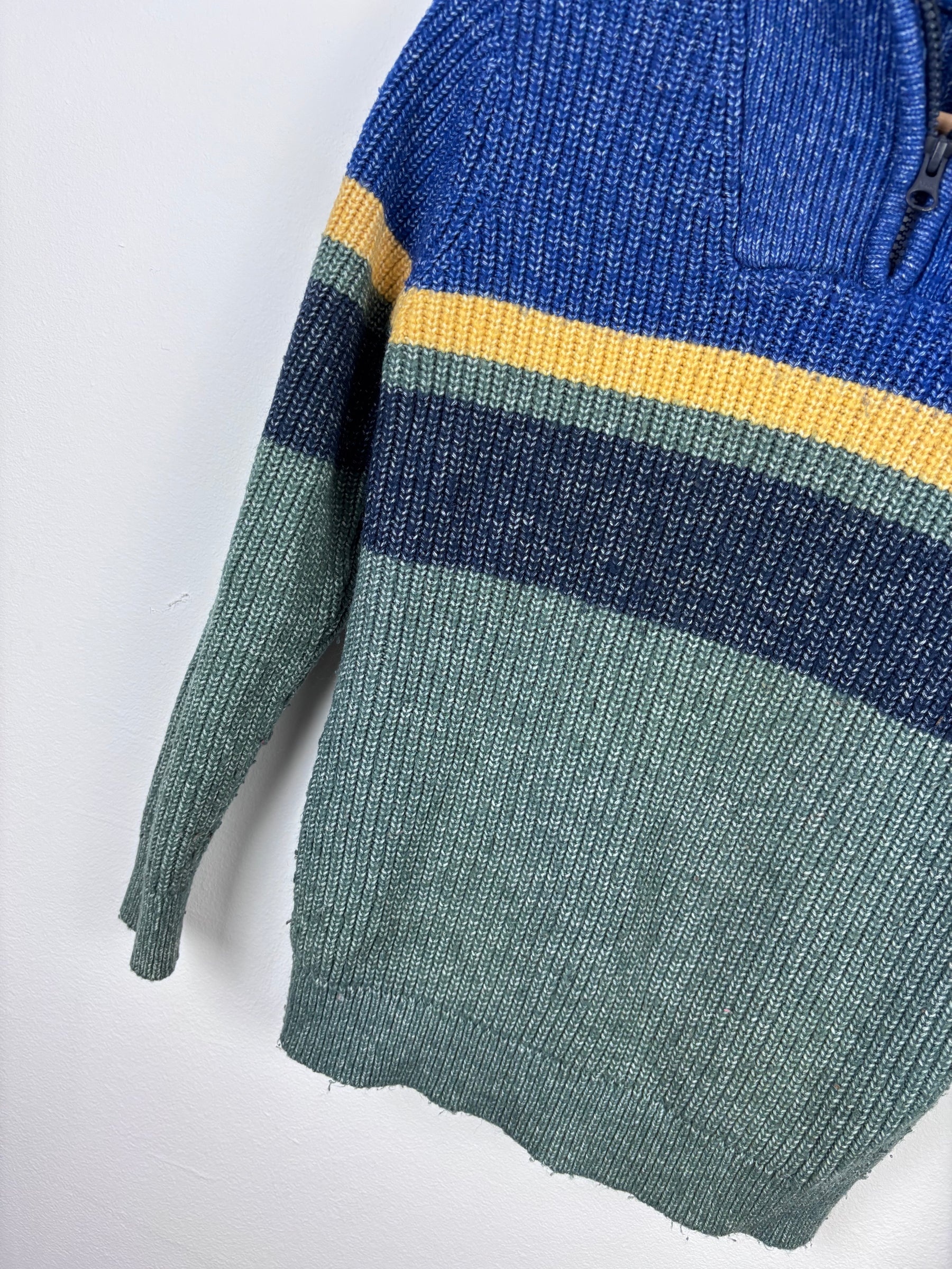 This M&S jumper has thick stripes in blue, mustard and green with a half zip at the top which gives it a cosy look. The knit feels warm and chunky which makes it great for colder days. It is in very good condition with no noticeable marks and the colours still look strong. The fit is comfy and perfect for children who like a snuggly layer. This jumper works well for school runs, weekends and outdoor play. It is a brilliant pick for second hand and preloved children’s fashion from M&S.