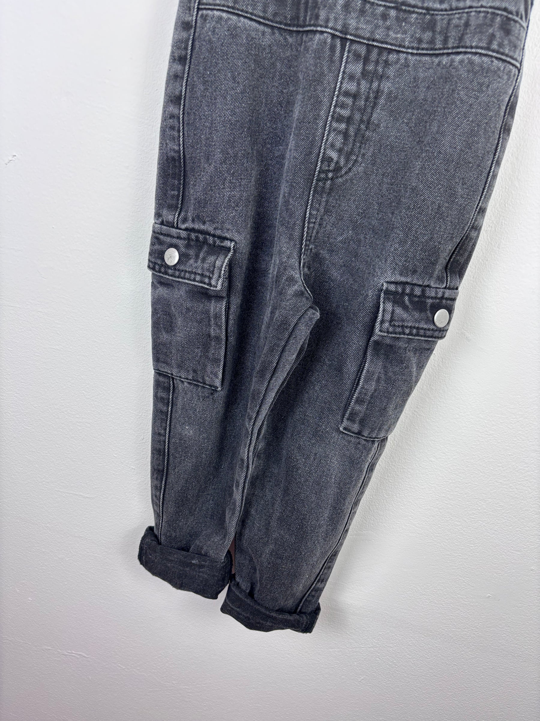 These MG Kids denim dungarees are a dark wash with pockets on the legs and a front chest pocket with the MG Kids logo. The denim feels durable but still soft enough for kids to move around in. They are in very good condition with no marks that I can see. The straps adjust which helps with the fit and the cuffs can be rolled if needed. These dungarees are great for children who like sturdy clothes they can play in. They make a lovely second hand and preloved fashion find from MG Kids.