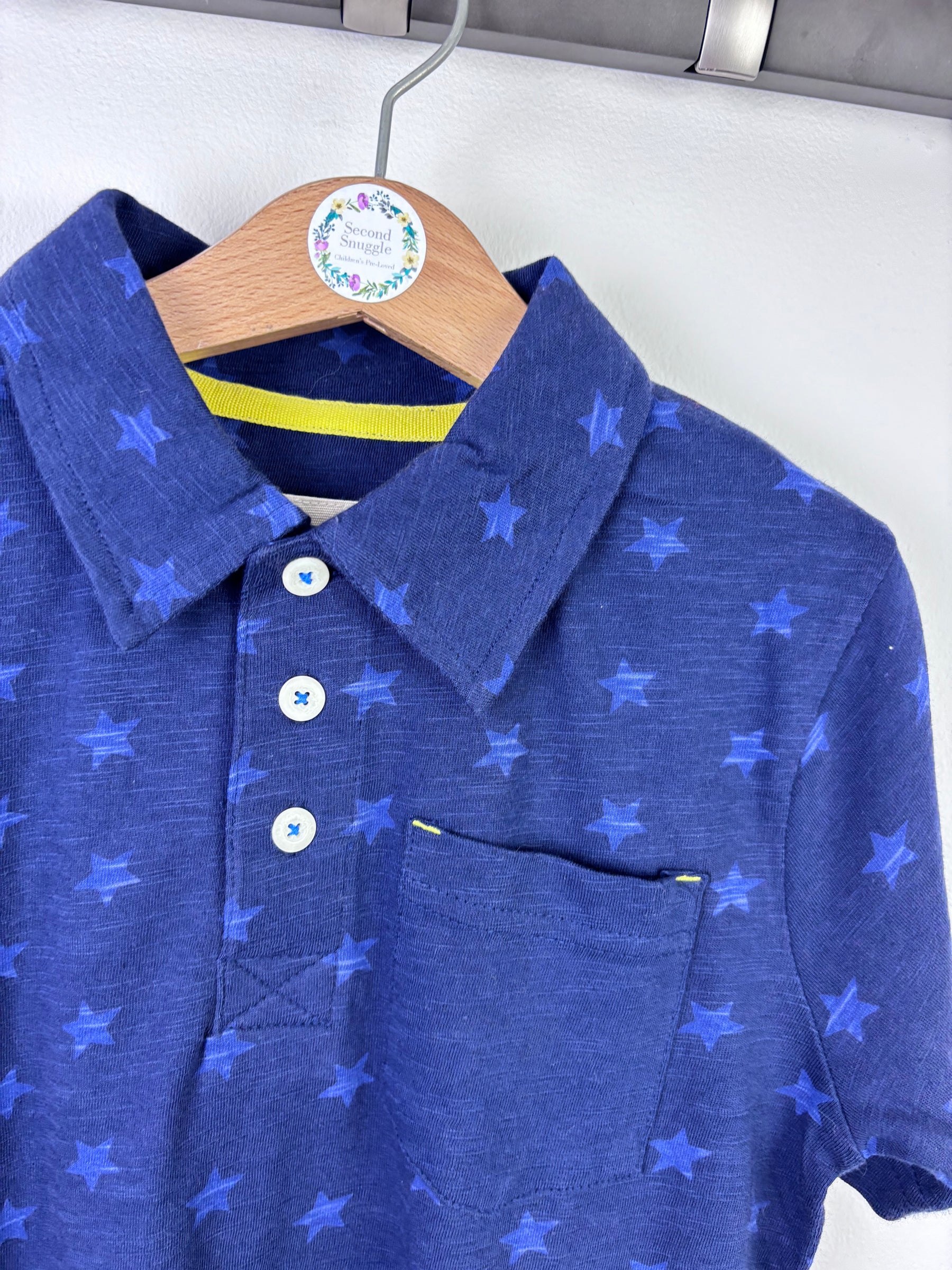 This Mini Boden polo shirt features an all-over star print in lighter blue against a navy background. Designed with a classic collar, button placket and soft fabric, it offers a smart-casual look while remaining comfortable. New without tags and unworn, it is in excellent condition. Easy to style with jeans, shorts or chinos, this is a high-quality piece and a great addition to a sustainable children’s clothing collection.