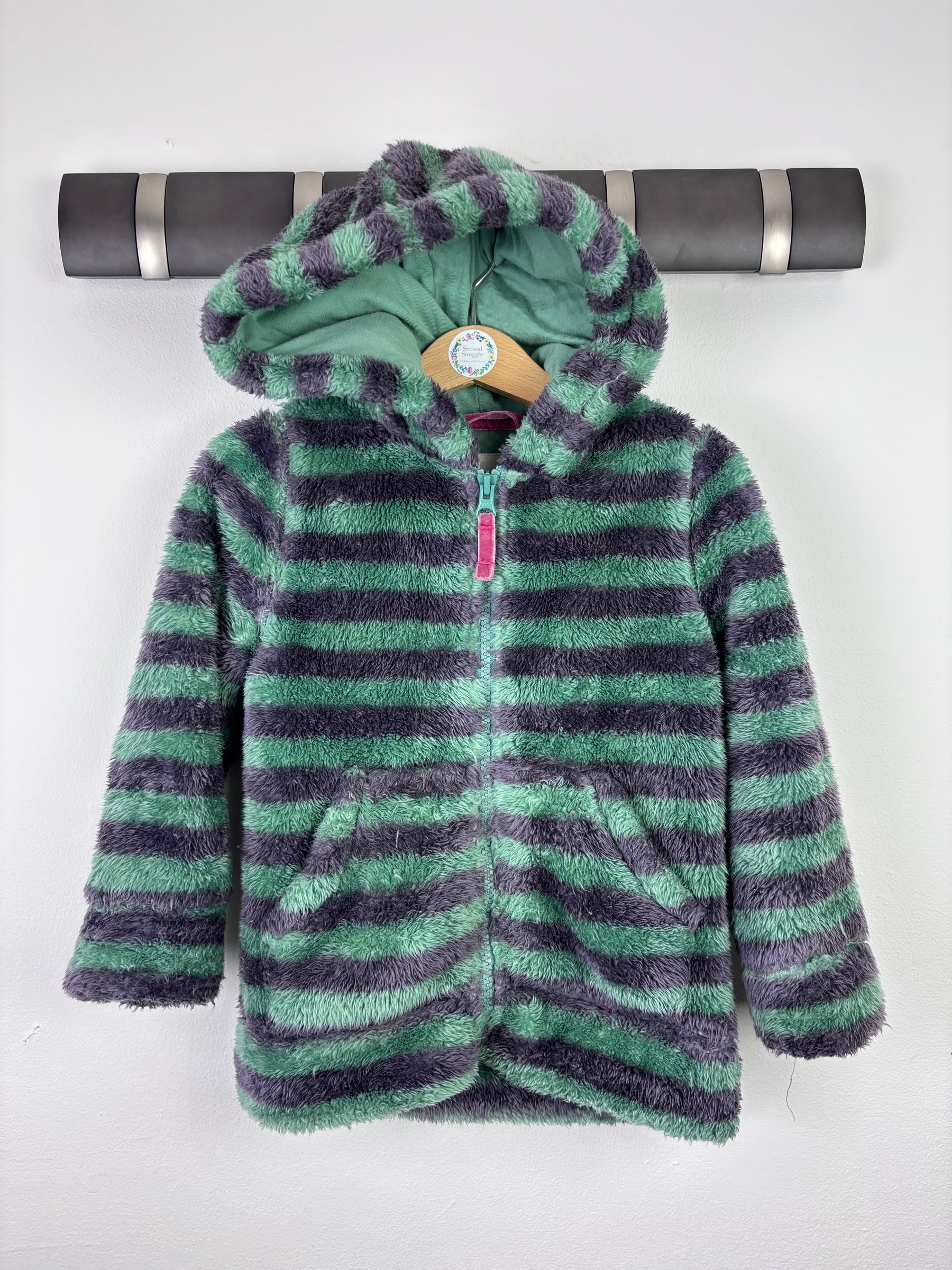 This Mini Boden fleece hoodie is a cosy and colourful layer for cooler days. Designed with bold stripes in green and purple tones, it features a soft fleece texture that feels warm and comfortable. The hood adds extra practicality, while the zip fastening makes it easy to put on and take off. Front pockets complete the relaxed look. In good condition with visible signs of wear but plenty of life left. A fun and practical piece, perfect for everyday use and second hand children’s clothing collections.