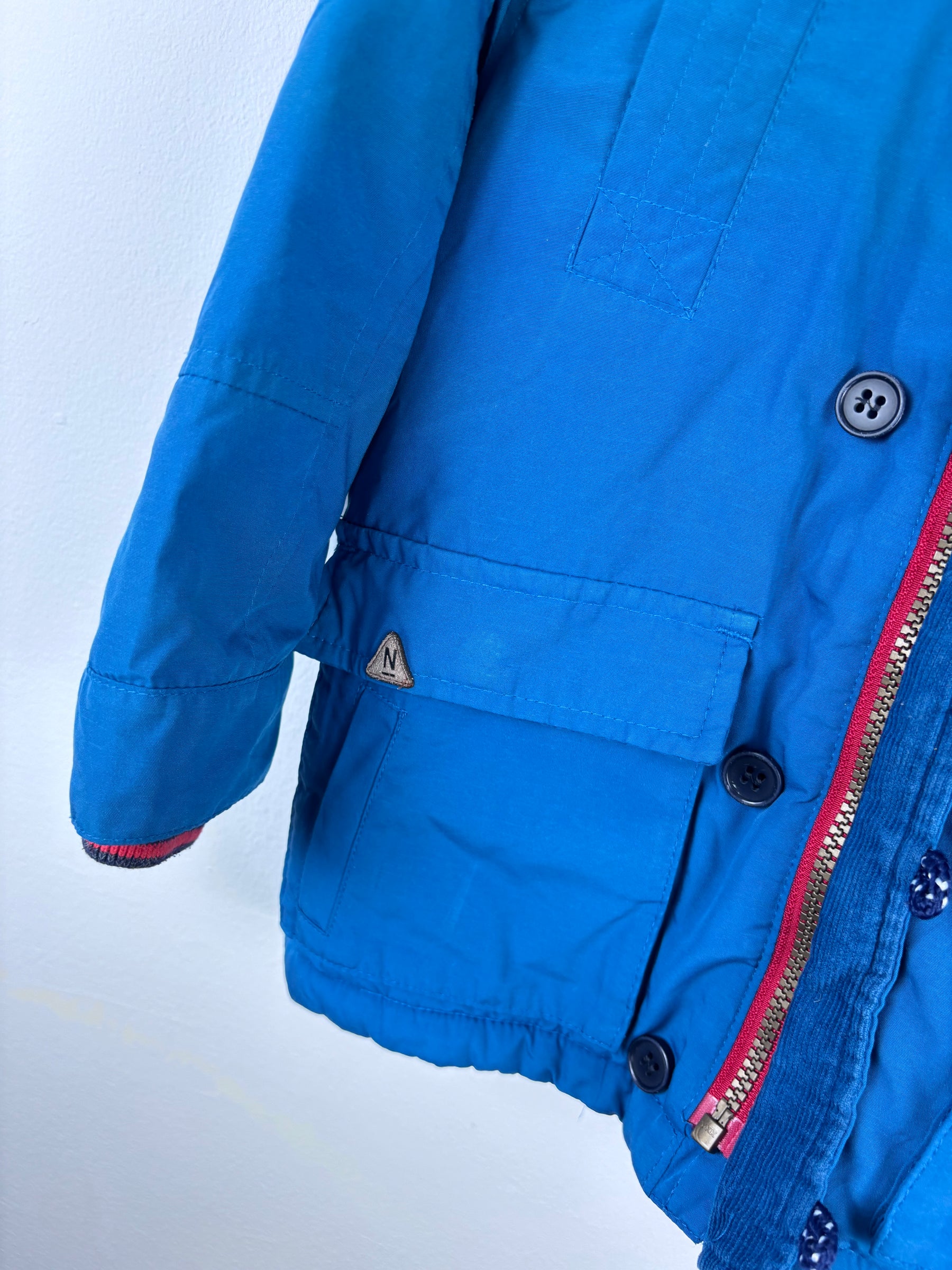 This blue parka from Next is designed for warmth and comfort on cold days. It has a soft lining, faux fur-trimmed hood and handy front pockets for keeping little hands warm. The zip and button fastening help lock in heat and keep out chilly winds. Its durable design makes it ideal for everyday wear through winter. This preloved coat is a lovely second hand find that’s both practical and cosy for busy little explorers.