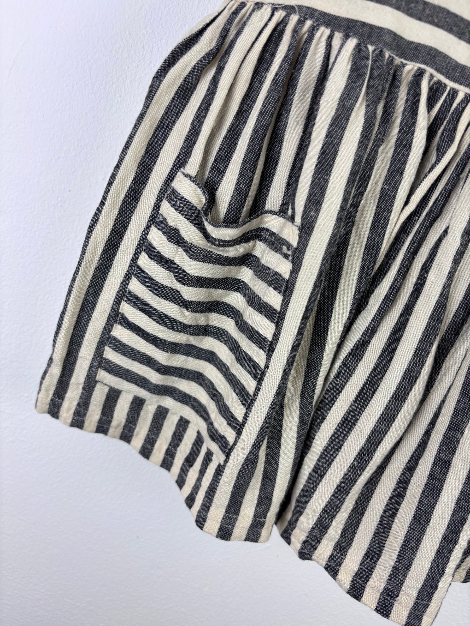 This Tu dress in size 12-18 months is in good condition. It has cream and navy stripes with a gathered waist and two small front pockets for added detail. Made from soft, lightweight cotton that’s gentle on delicate skin. This preloved dress is a great second hand choice for everyday wear, perfect for warm days or layered with tights and a cardigan in cooler months. A simple and classic design that makes dressing little ones both easy and stylish.
