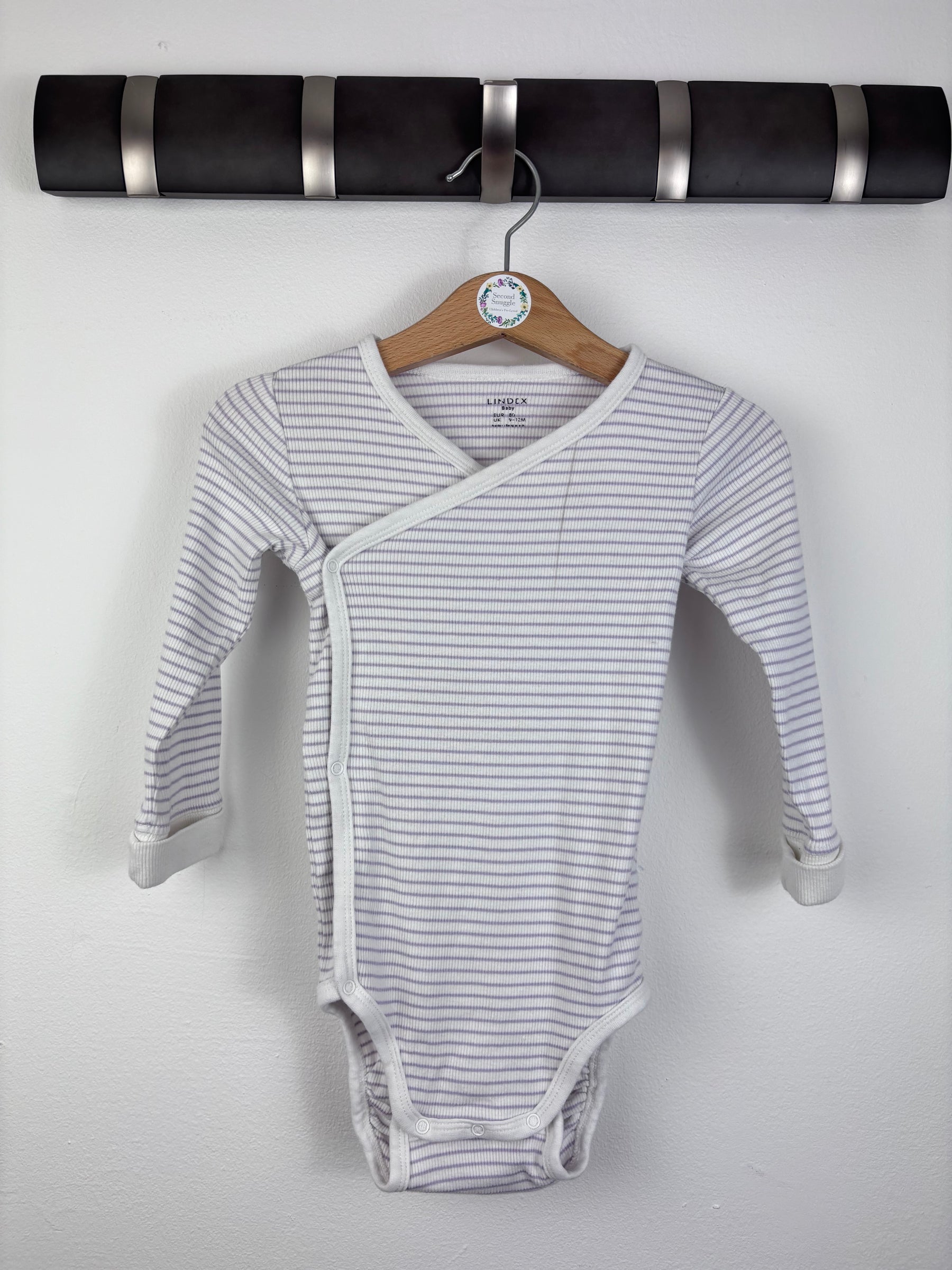 This Lindex wrap bodysuit in size 12-18 months is in good condition, with a mark shown. It is white with grey stripes and features a wrap-over design with poppers along the side and bottom for easy dressing. The fabric is soft and gentle, making it perfect for everyday comfort. Long sleeves make it suitable for layering or wearing alone. This second hand baby bodysuit is a great practical choice while still looking neat and stylish. A preloved piece of children’s fashion that is affordable, sustainable, and comfortable for little ones.
