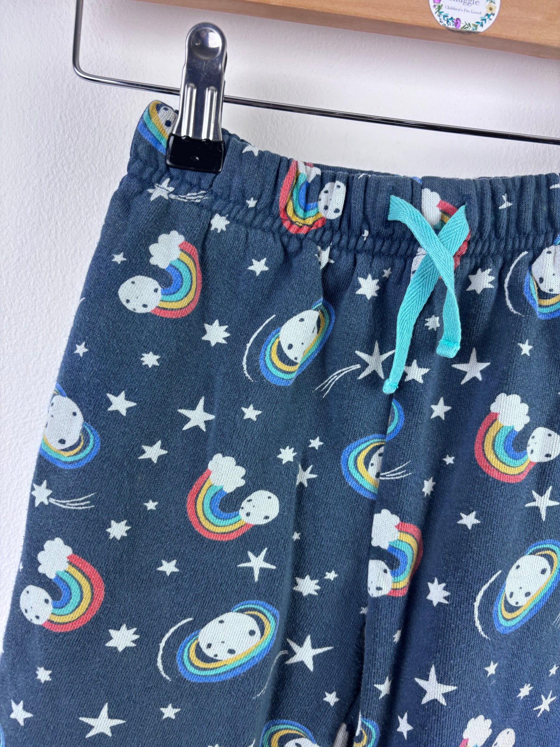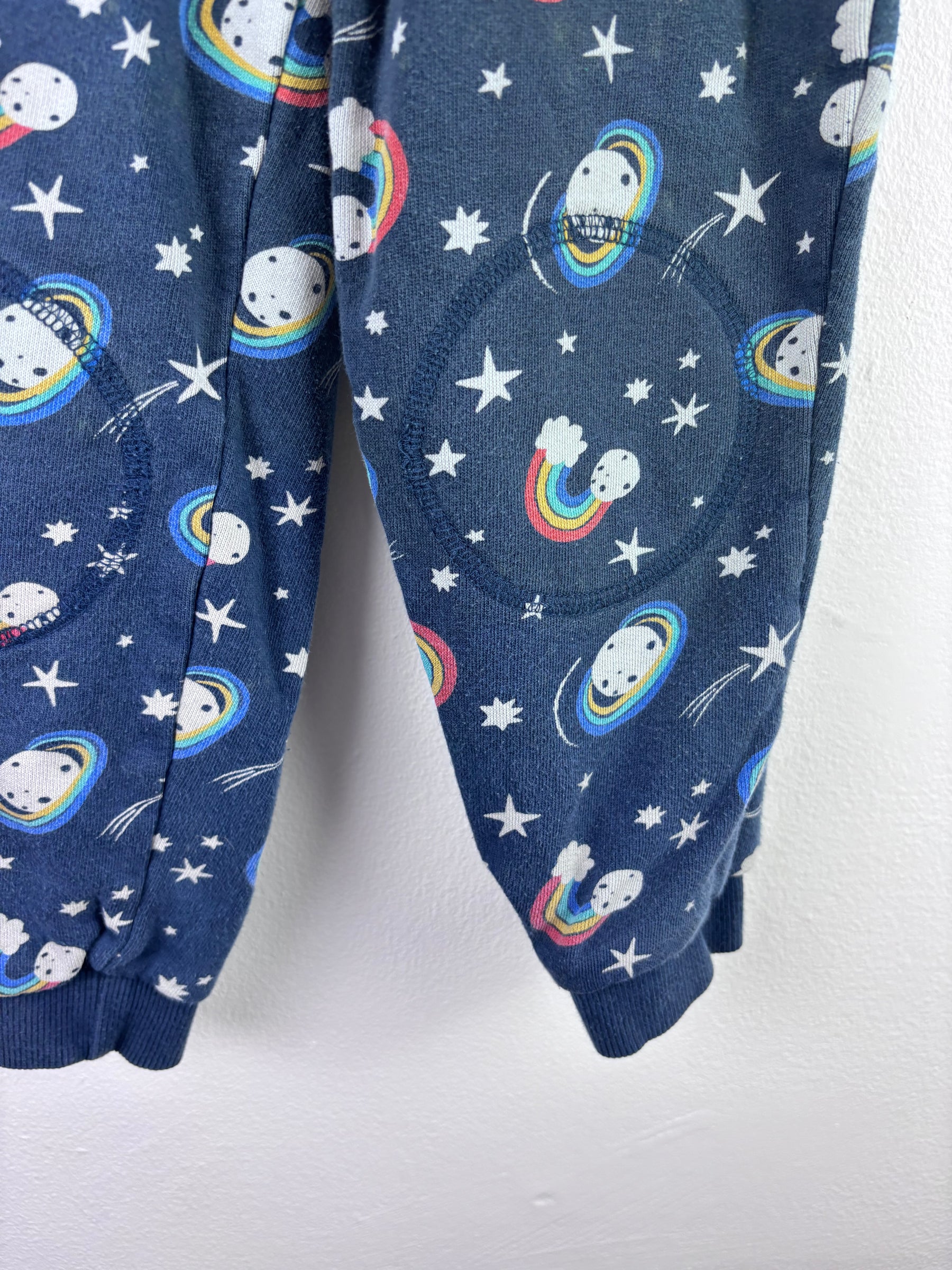 Navy joggers from Frugi with a colourful rainbow and space-themed print and an elasticated waist with drawstring. Designed for comfort, they’re perfect for active days and relaxed outfits.