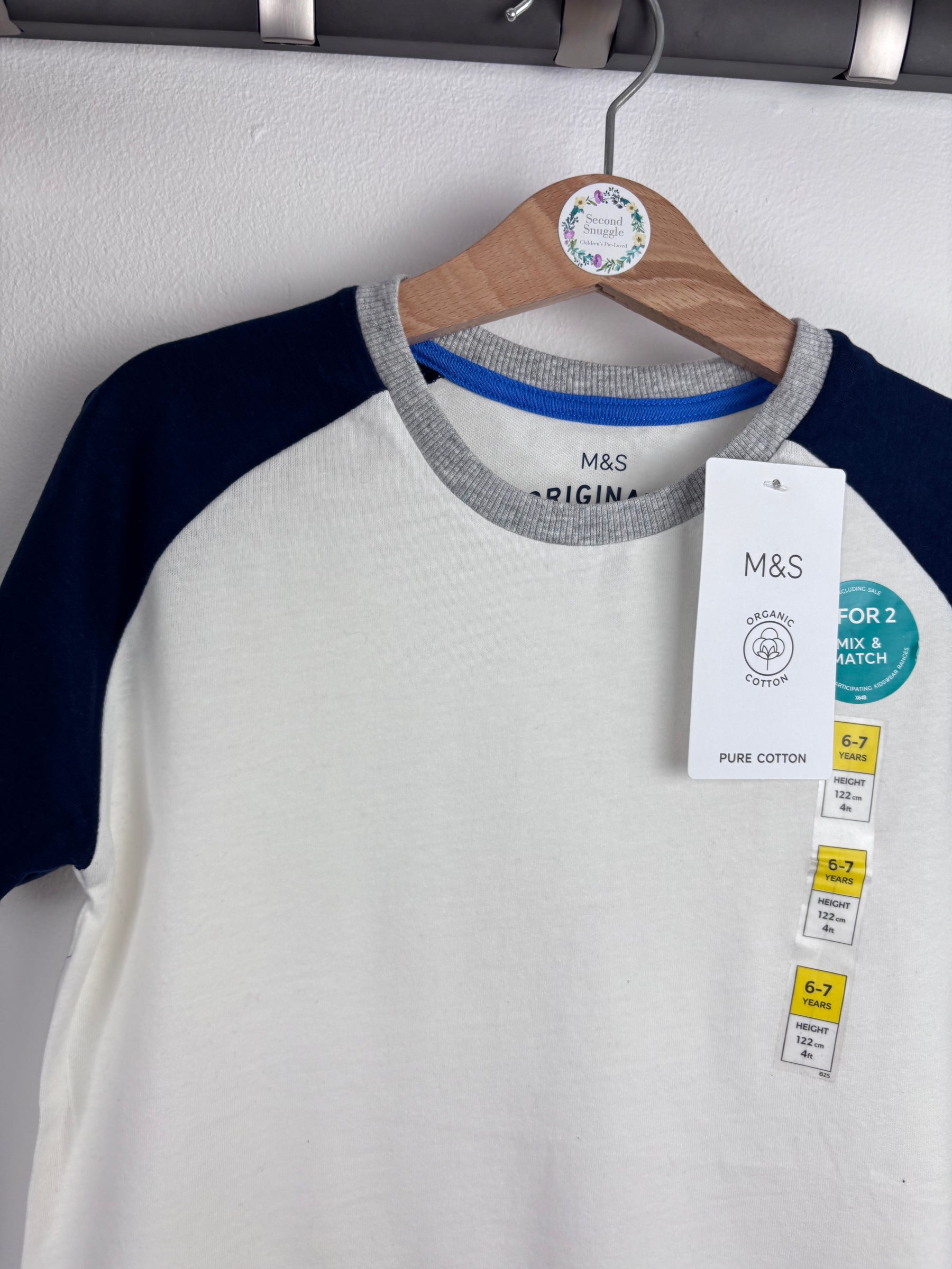 A brilliant two-pack of new M&S cotton t-shirts in size 6-7 years. Includes a navy and white striped tee and a white top with navy sleeves, both brand new with tags. Soft and breathable, these ex-stock tops are ideal for everyday adventures, holidays, or layering under jumpers. Known for great quality, M&S pieces wash well and last beautifully, making them a sustainable choice for growing kids. Perfect for parents who love stylish, practical children’s clothing at affordable prices. A lovely find for any second hand wardrobe.