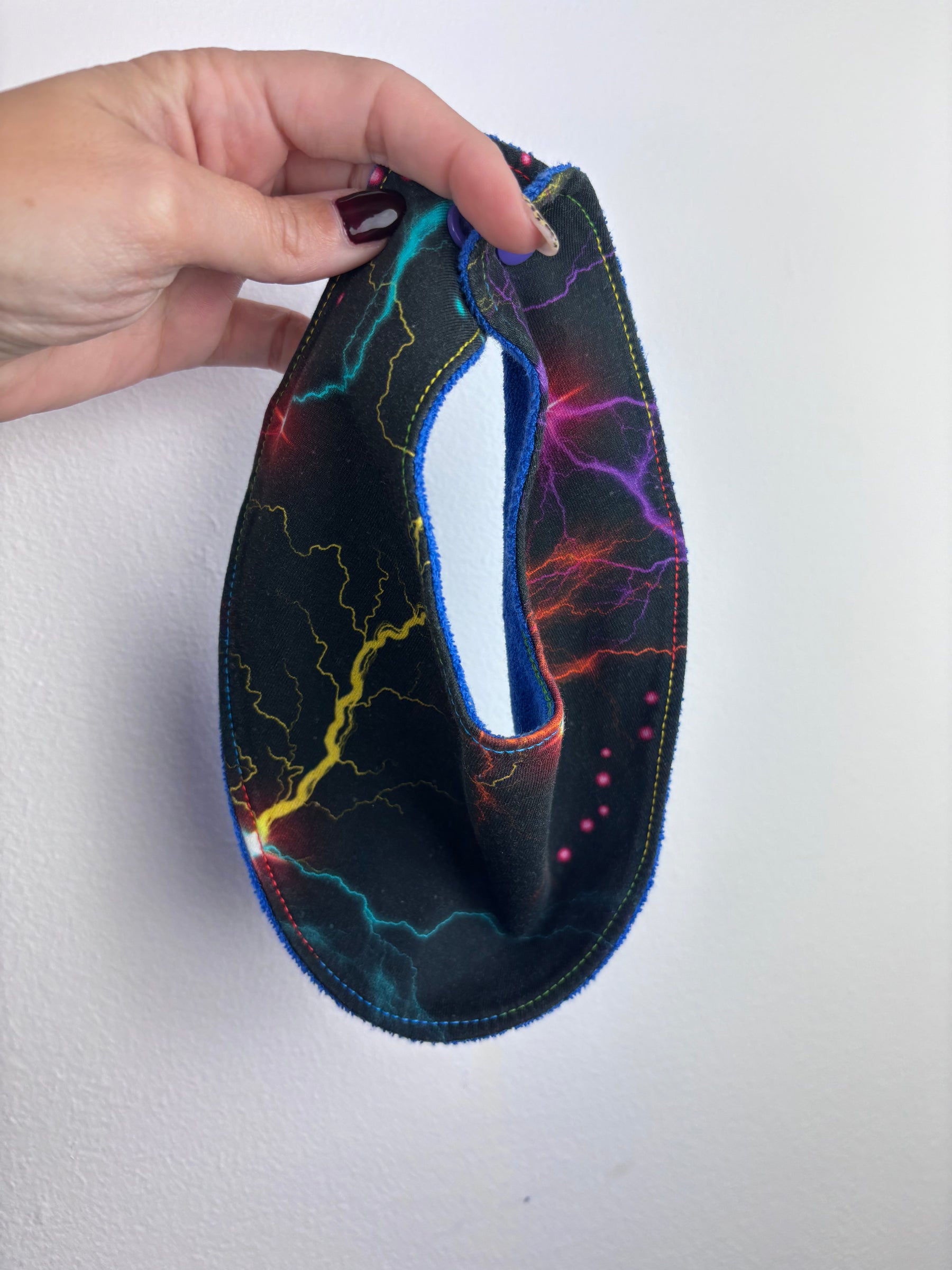 This unique handmade set features bright lightning patterns on a dark background with vibrant purple cuffs and a coordinating bib. Made from soft stretch cotton, it’s designed to be practical and comfortable for active babies. The colourful design makes it a fun and standout choice for everyday wear. Each piece is individually made, offering something truly special. This preloved second hand handmade outfit helps reduce waste and supports sustainable baby fashion while keeping your little one stylish and comfortable all day long.