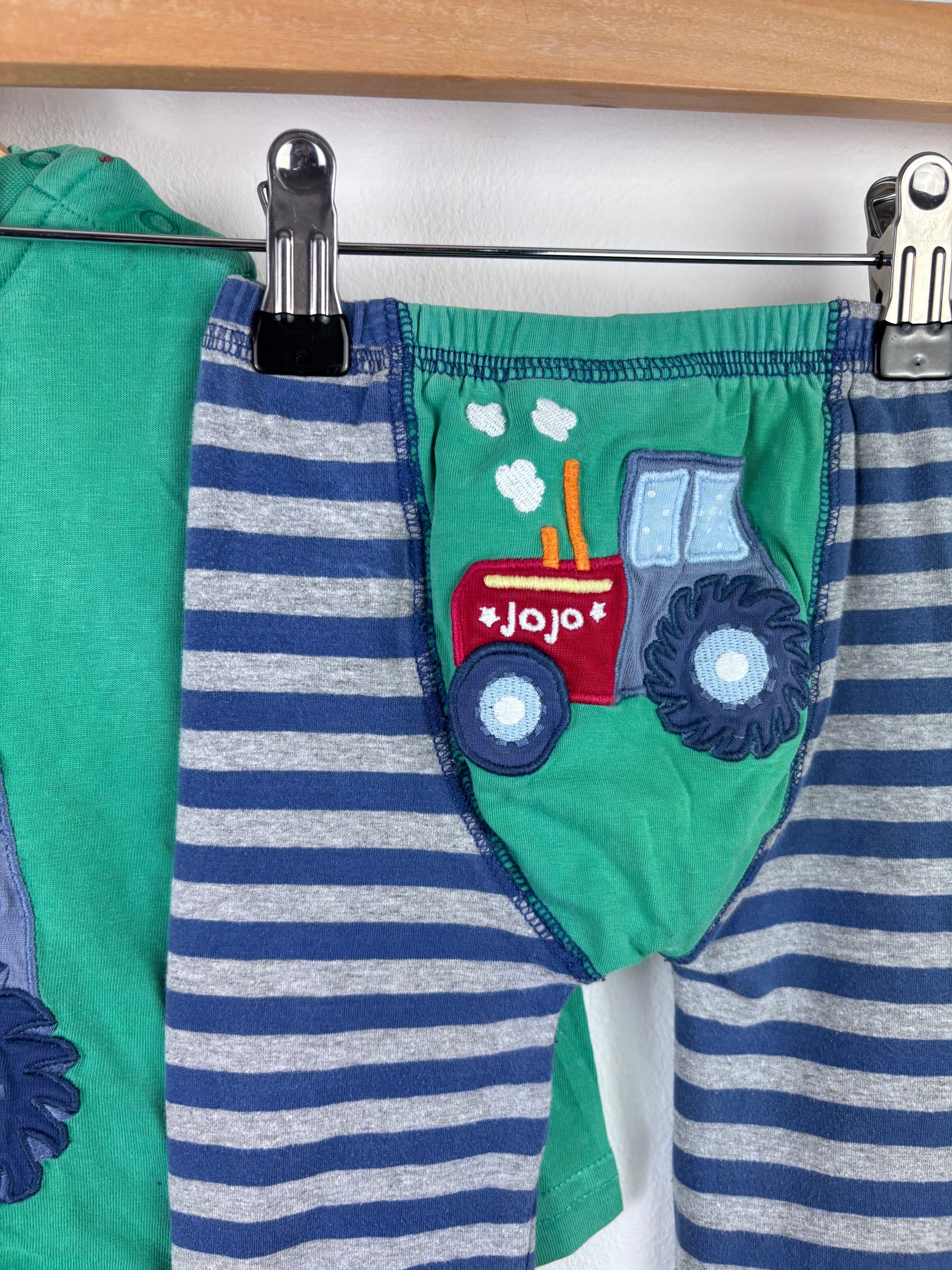 This JoJo Maman Bébé set includes a green top with an appliqué tractor and striped blue leggings. Made from soft cotton, it’s perfect for playtime or naps. There’s a small hole and light marks on the top, so it’s classed as play wear, but still has plenty of life left. A preloved second hand set that’s ideal for everyday use and families who love sustainable choices. A cute, comfy outfit that celebrates fun, quality, and eco-friendly children’s fashion.