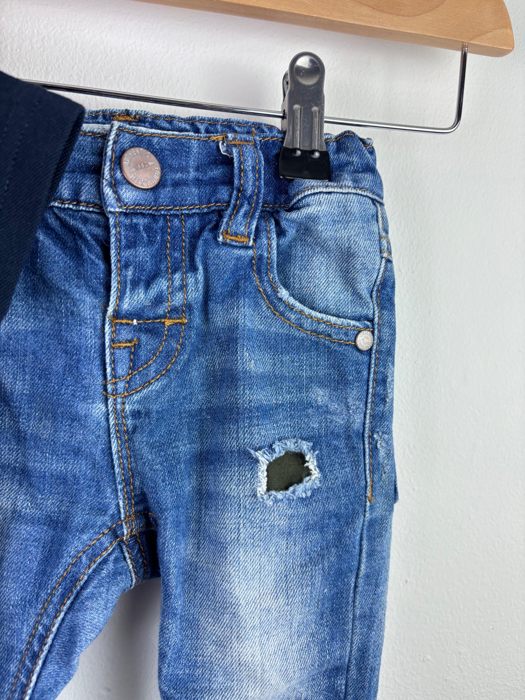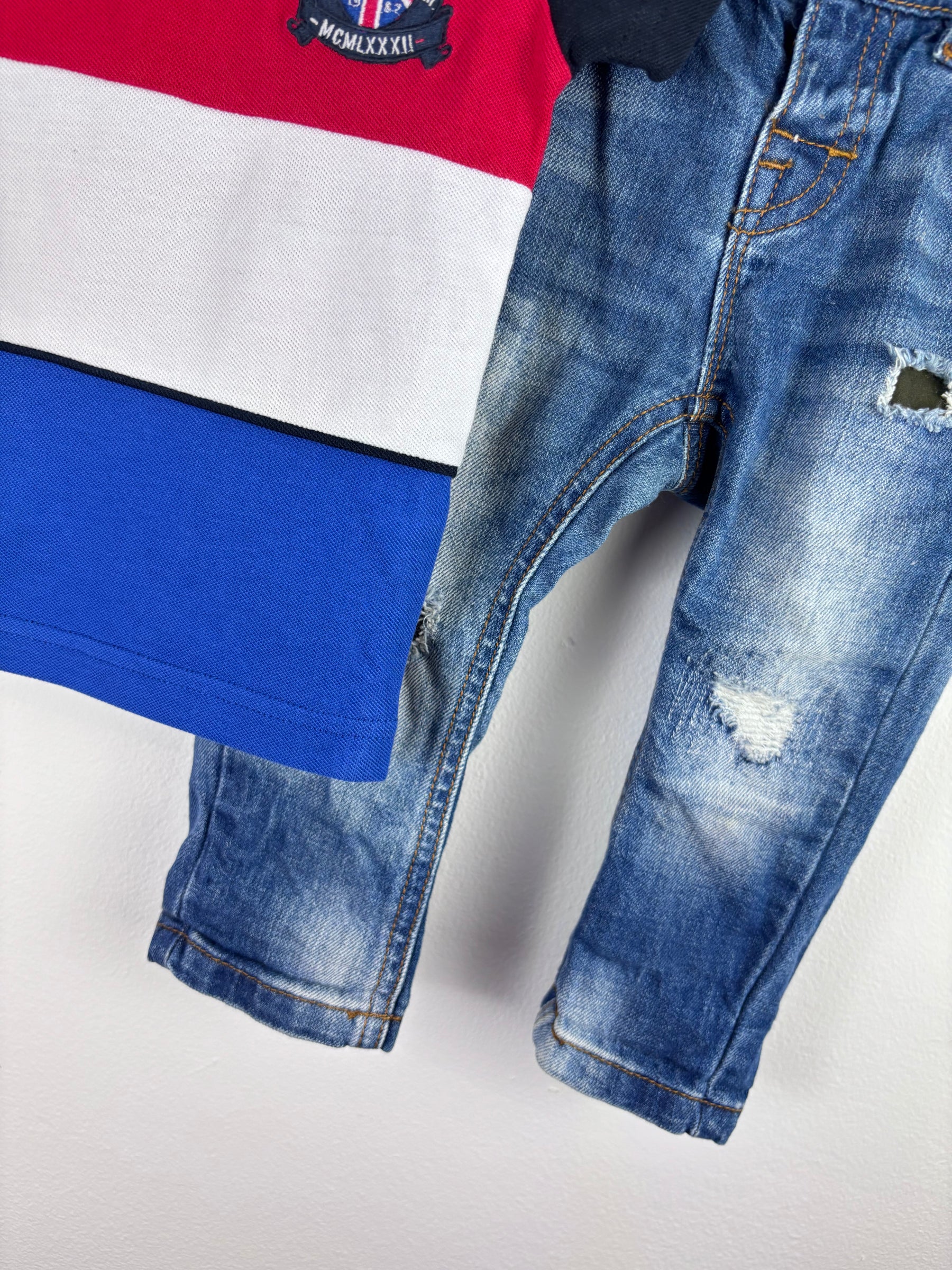This Next outfit in size 6-9 months is in excellent condition. It includes a red, white and blue colour-block t-shirt with an embroidered logo and a pair of lightly distressed jeans. Both pieces are soft and comfy, perfect for everyday wear. This preloved set is a great second hand choice for adding a touch of style to baby wardrobes. Ideal for playdates or outings, it’s a fun and practical outfit that keeps little ones looking cool and comfortable.