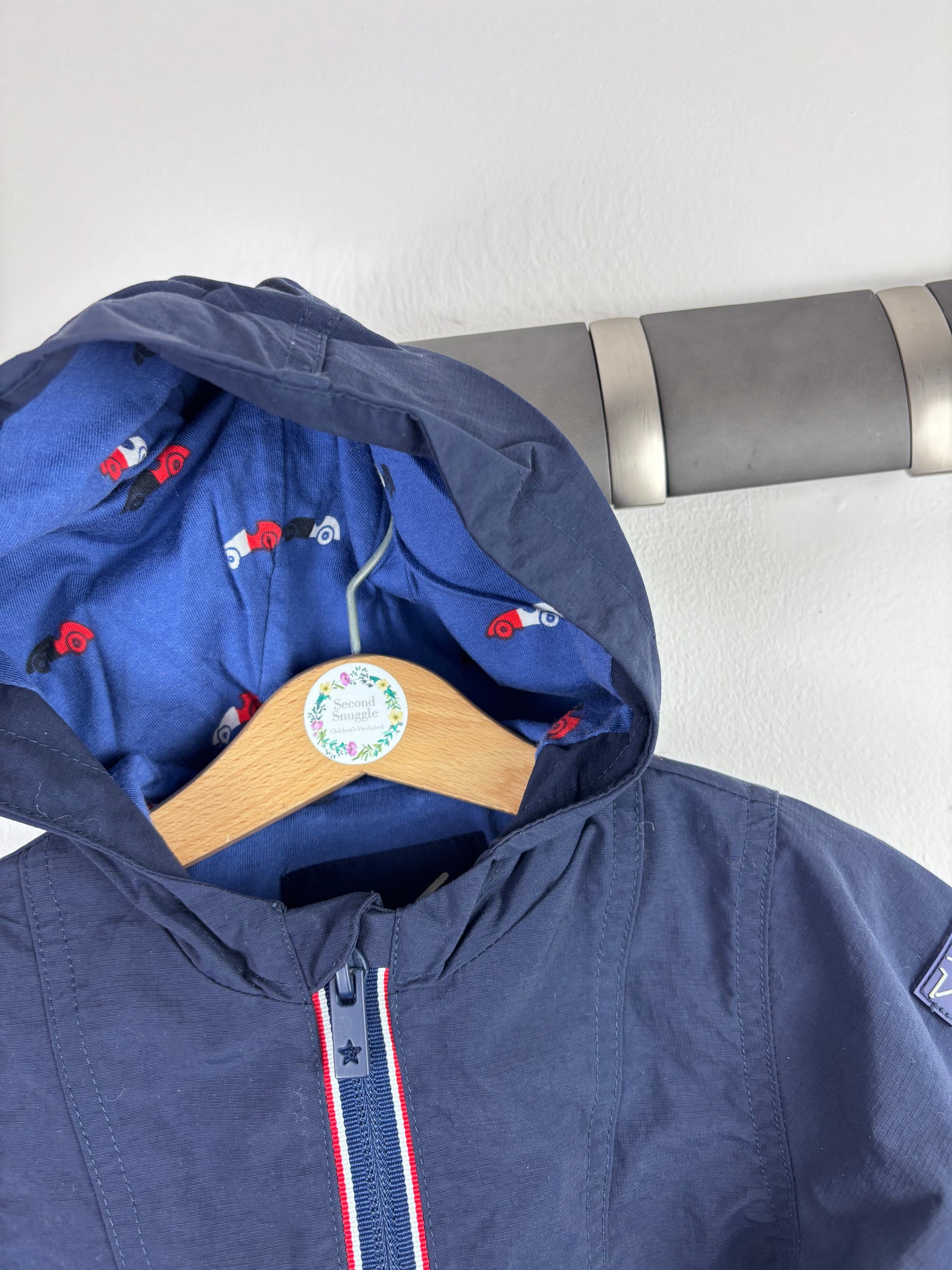 This Next jacket in size 6-9 months is in very good condition. It’s navy with a bright car print lining and a zip front for easy dressing. Lightweight and water-resistant, it’s perfect for rainy days and outdoor adventures. The hood keeps little ones dry, while the soft inner fabric ensures comfort. This preloved jacket is a lovely second hand find for baby wardrobes. Both practical and cute, it’s ideal for year-round wear, keeping children cosy and protected whatever the weather.