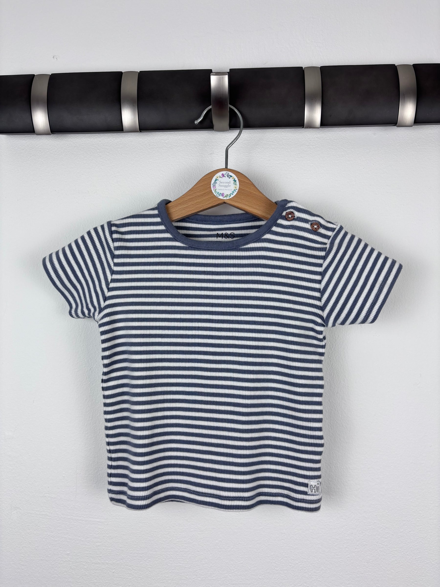 This M&S short sleeve t shirt features classic blue and white stripes with button detail on the shoulder for easy dressing. It has a simple shape that works well with jeans, leggings or shorts. In very good condition with minimal signs of wear. This is a second hand item that still looks fresh and tidy. A timeless preloved piece for babies and children. Great for everyday kids fashion and easy outfits all year round.