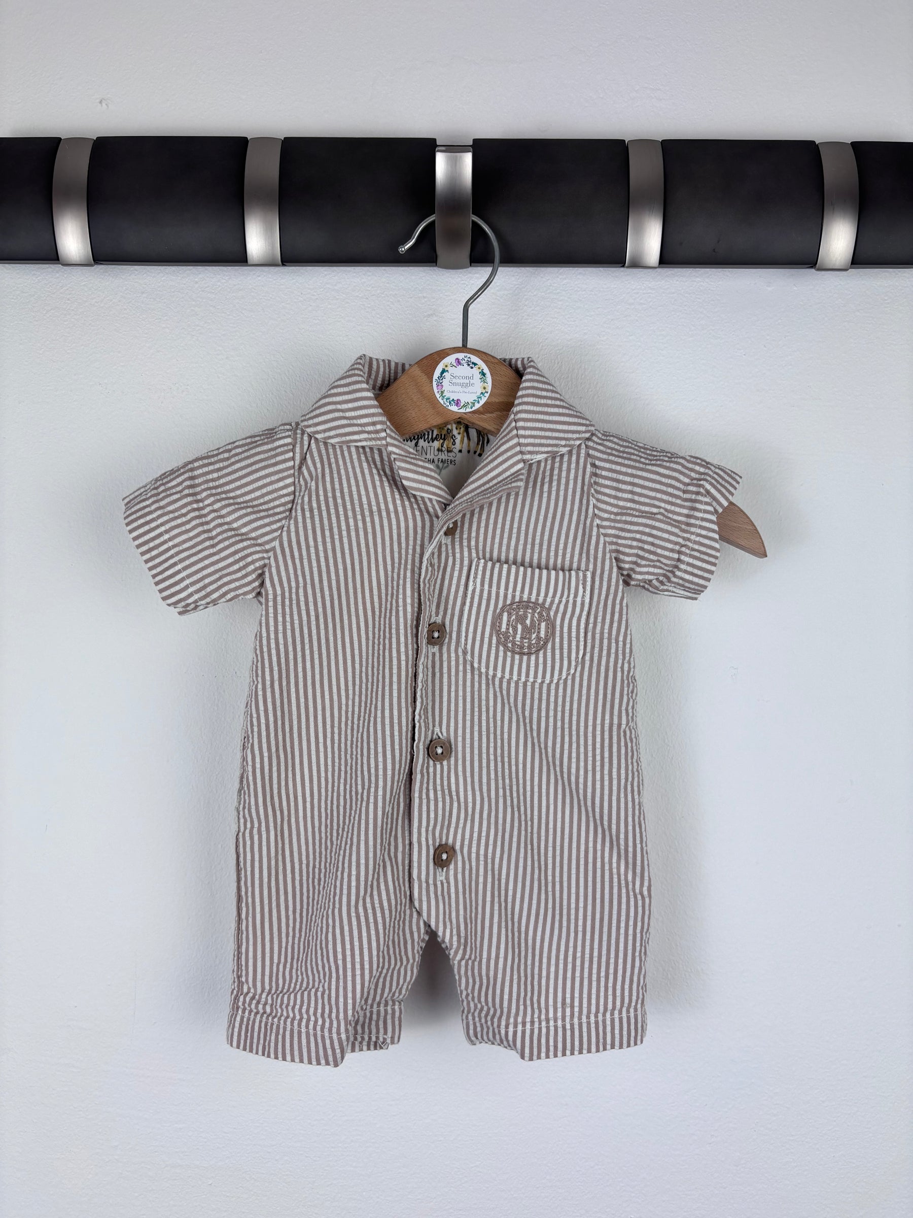 This Fred & Flo romper is a newborn size and in good condition. It has a beige and white stripe design with short sleeves, collar, and button front fastening. Soft and lightweight, it is easy to dress babies in and ideal for warm weather or layering with cardigans. Choosing second hand baby clothing gives families a way to shop affordably while helping the environment. This preloved romper is a simple and practical piece for newborns, offering style, comfort, and sustainability from the very start of their wardrobe.