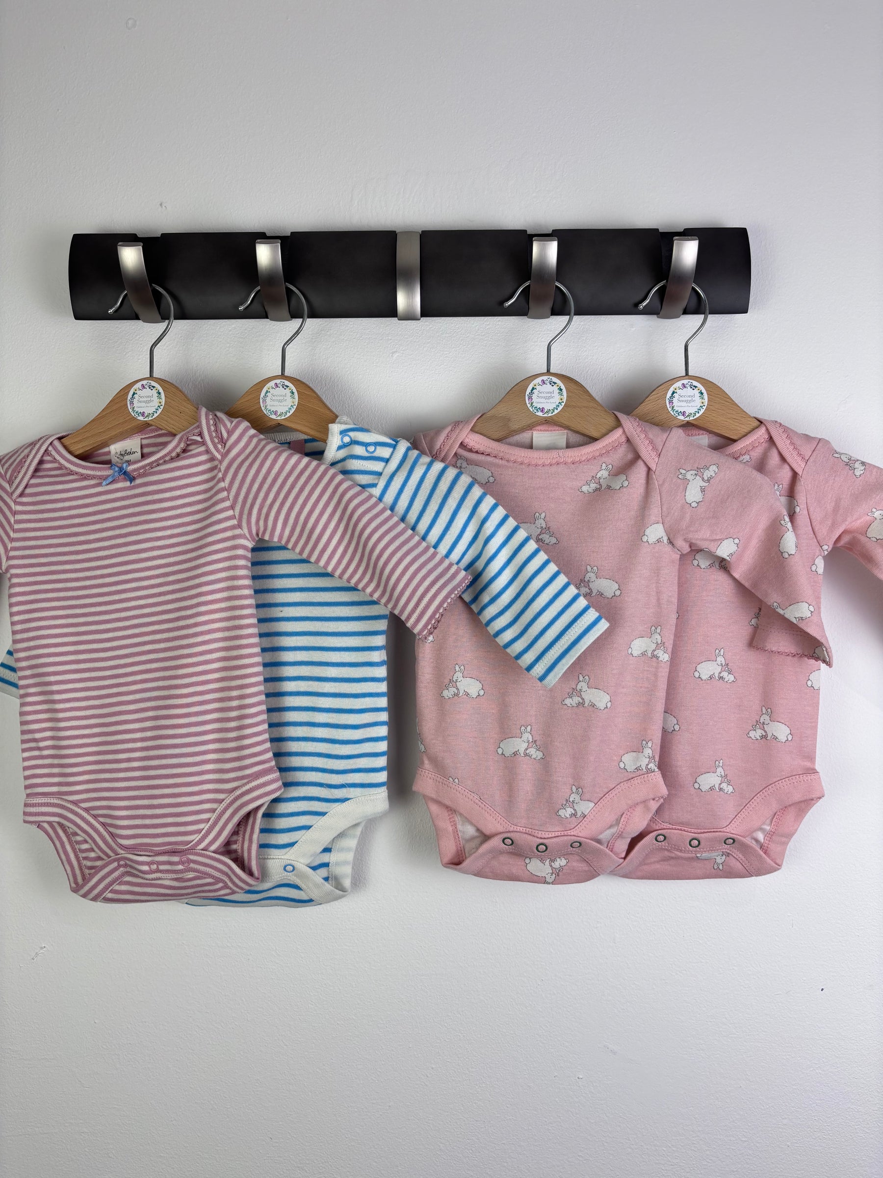 This Baby Boden bodysuit set includes four long sleeve vests in soft pink and blue tones. Designs include pink stripes, blue stripes, and sweet bunny prints, making them perfect for everyday wear. Made from gentle cotton, they feel soft on baby skin and are comfy for sleeping, playing, and cuddles. Popper fastenings at the bottom make nappy changes quick and easy. These bodysuits are new without tags and unworn. Ideal for baby fashion that parents trust, great for kids and children’s clothing collections including second-hand and preloved styles. Two of the vests don't have a bow as shown.