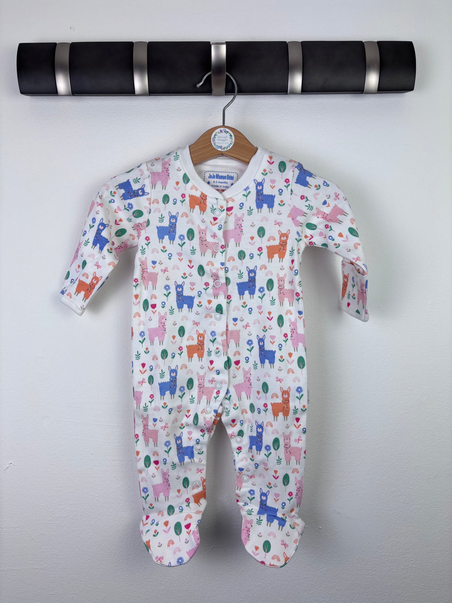 This JoJo Maman Bebe sleepsuit is white with a colourful llama and floral print all over. It has long sleeves, enclosed feet, and popper fastenings down the front and legs for easy changing. Made from soft cotton, it feels gentle on baby skin and is comfy for day or night wear. The bright print makes it fun while still being practical. This sleepsuit is new without tags and unworn. A lovely piece for baby fashion and a great addition to children’s clothing collections including second-hand and preloved styles.