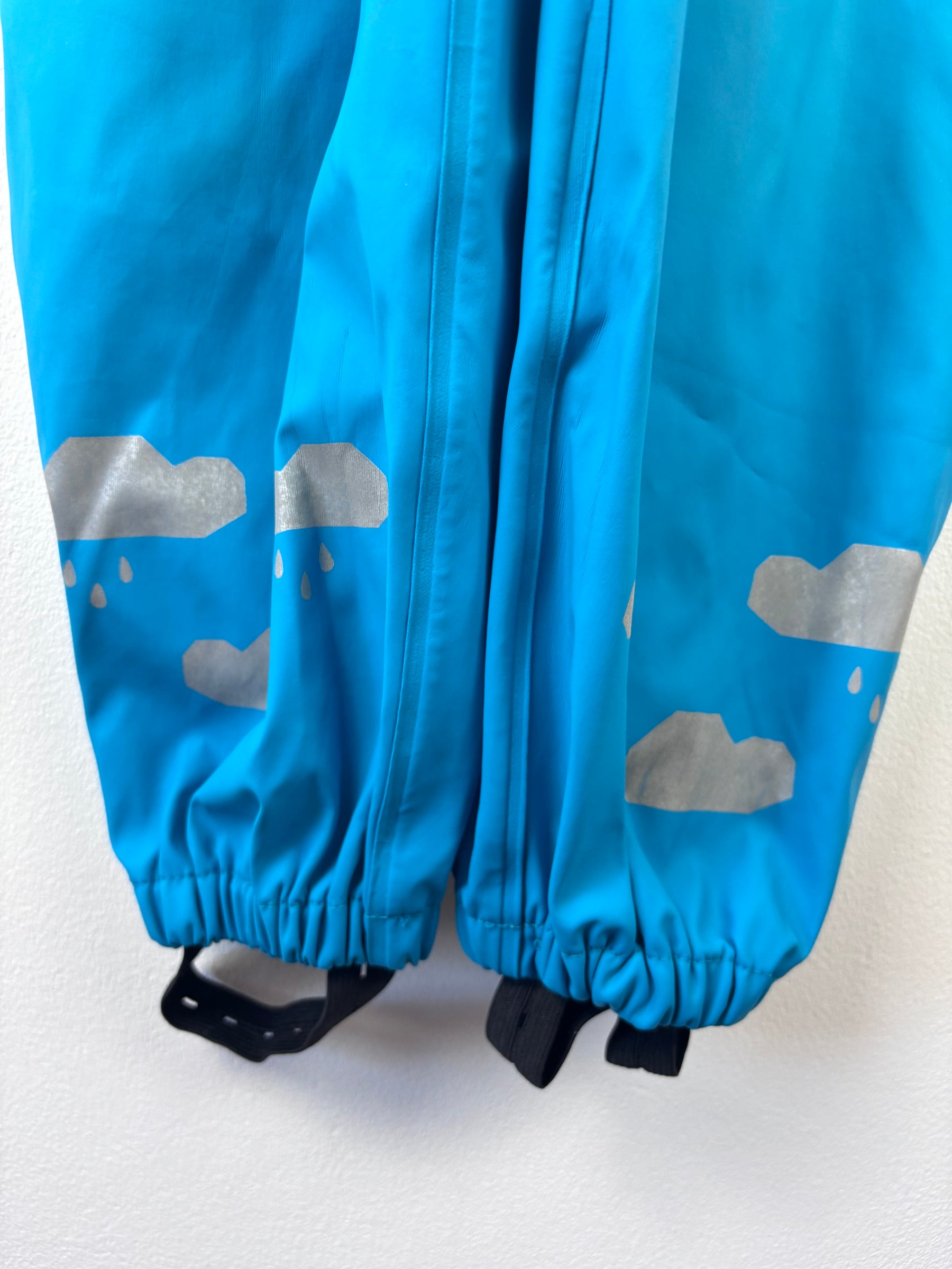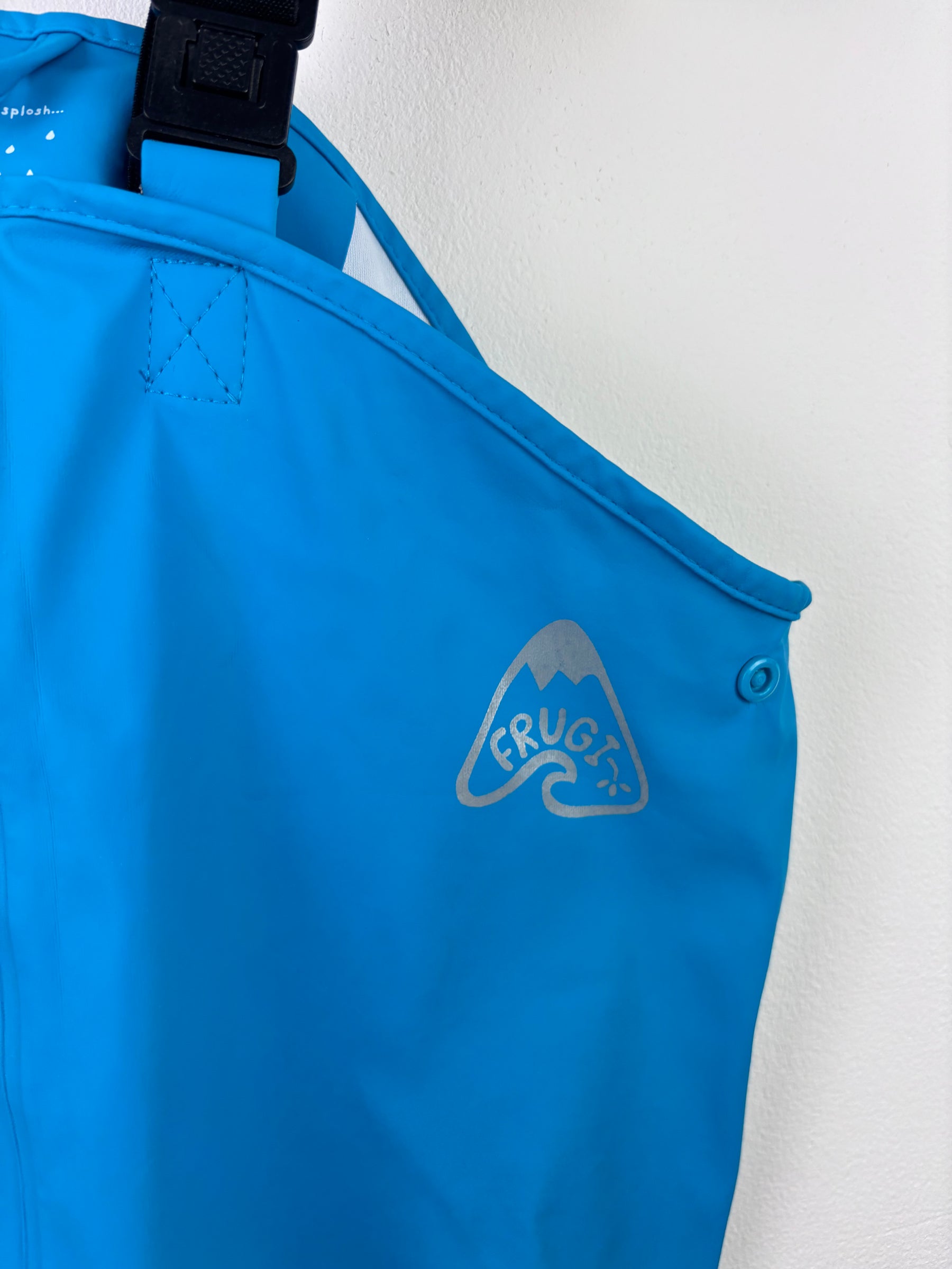 These Frugi waterproof dungarees in bright blue are in very good condition and ideal for keeping little ones dry on wet and muddy days. Designed with adjustable straps and elasticated hems, they offer a comfortable and secure fit for active play. The reflective cloud details add extra safety for outdoor adventures. A brilliant piece of second hand children’s clothing that’s made to last. Frugi is known for quality and sustainable fashion, making this preloved pair of dungarees a practical choice for toddlers. Great for outdoor fun in all weathers.