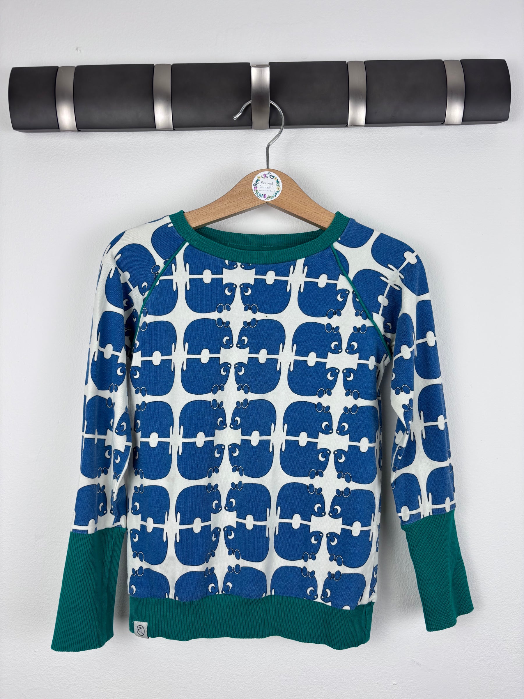 This Alba top in size 104 has a bold hippo print in blue and white with green trims that add a bright touch. It is made from soft cotton with long sleeves for extra warmth and is perfect for playtime or nursery days. The top is second hand and in very good condition with no major wear. It has a relaxed fit that makes it comfy to move around in. This preloved Alba piece is great for adding something fun and cheerful to your child’s wardrobe.