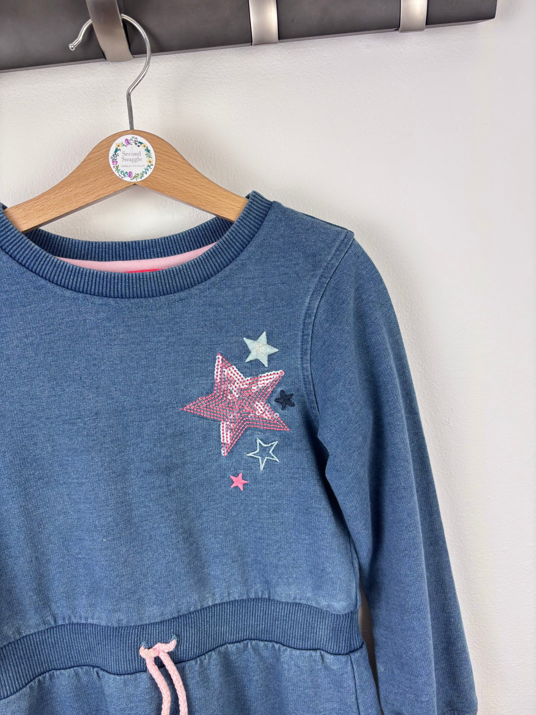 This Joules sweat dress is a soft denim blue shade with star appliques in pink and silver on the chest. It has long sleeves with striped cuffs and a pink drawstring at the waist. The fabric feels warm and cosy which makes it lovely for cooler days. It is in excellent condition with no marks and looks barely worn. This dress is great for children who like comfy everyday clothes with fun details. It is a lovely second hand and preloved kids fashion piece from Joules.