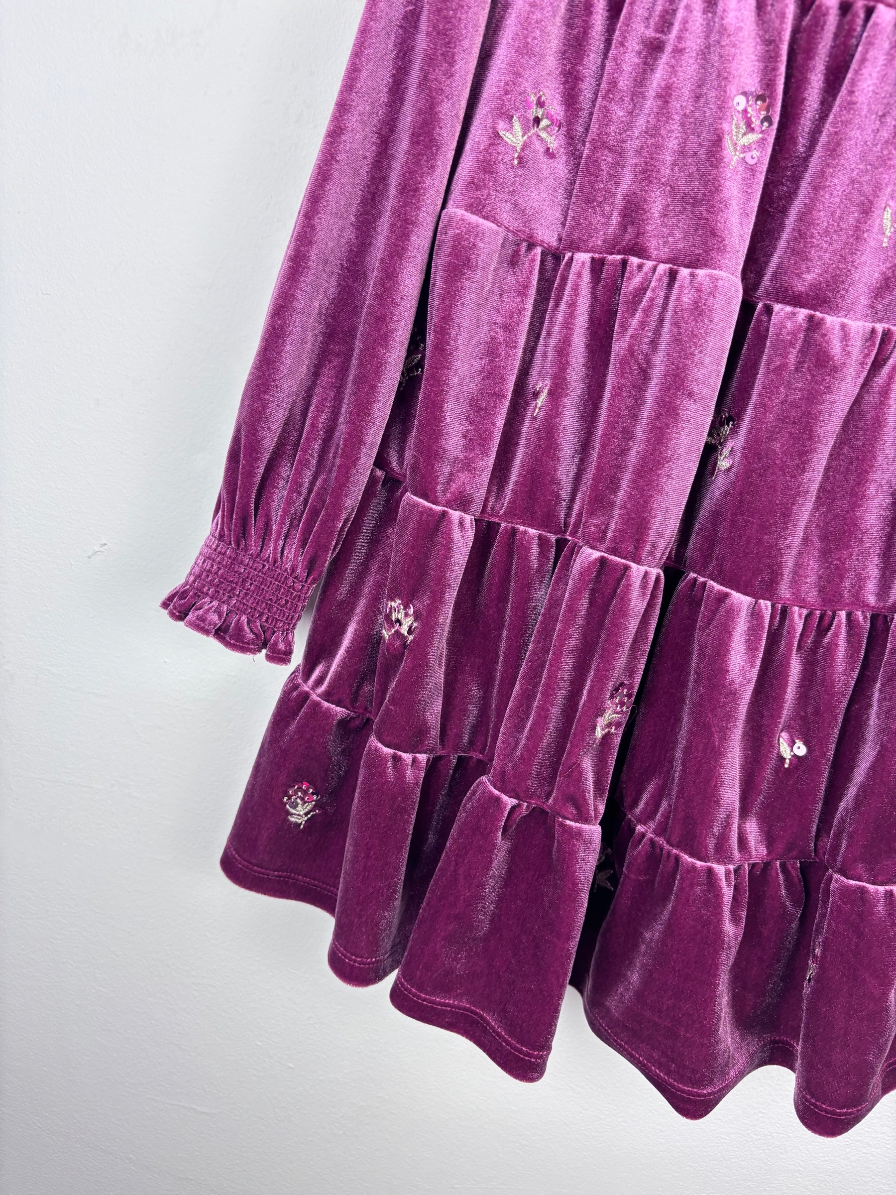 This beautiful M&S dress is made from soft purple velvet with delicate floral embroidery. It has long sleeves with elasticated cuffs and gentle gathers for a relaxed, floaty fit. Perfect for family parties or cosy festive days, it’s as comfortable as it is charming. In excellent condition, this preloved dress is a wonderful second hand find that combines quality with a classic feel. A lovely choice for little ones who enjoy dressing up in something soft, warm and full of detail.