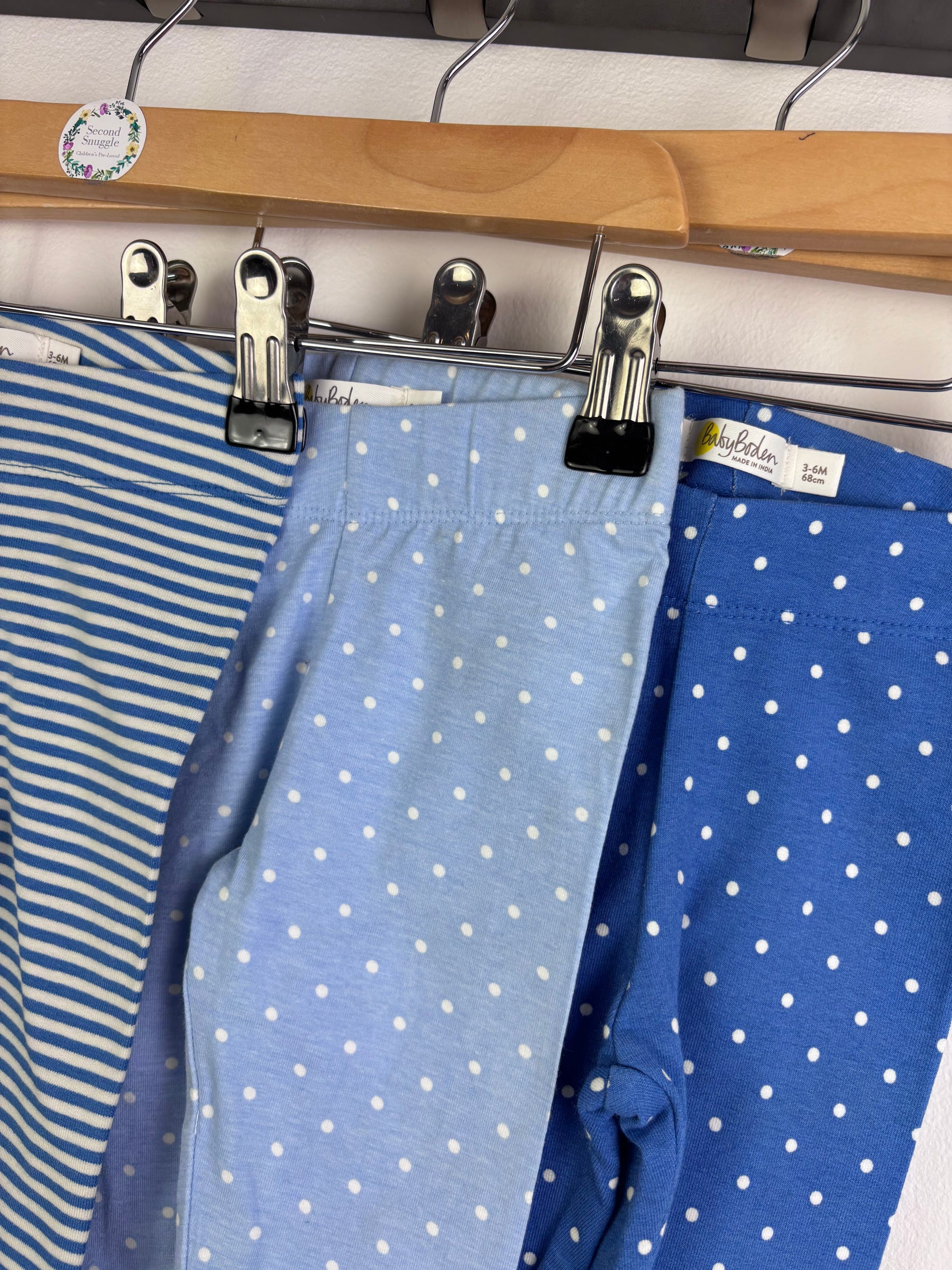 This Baby Boden leggings set includes three pairs in classic blue stripe and spot designs. Soft cotton fabric with gentle stretch makes them comfortable for daily wear. Elasticated waistbands sit neatly without feeling tight. These are brand new without tags and unused. This is a second hand bundle that has never been worn. These preloved Baby Boden leggings are well made with strong seams and no signs of wear. A practical and colourful set that mixes easily with bodysuits and tops.