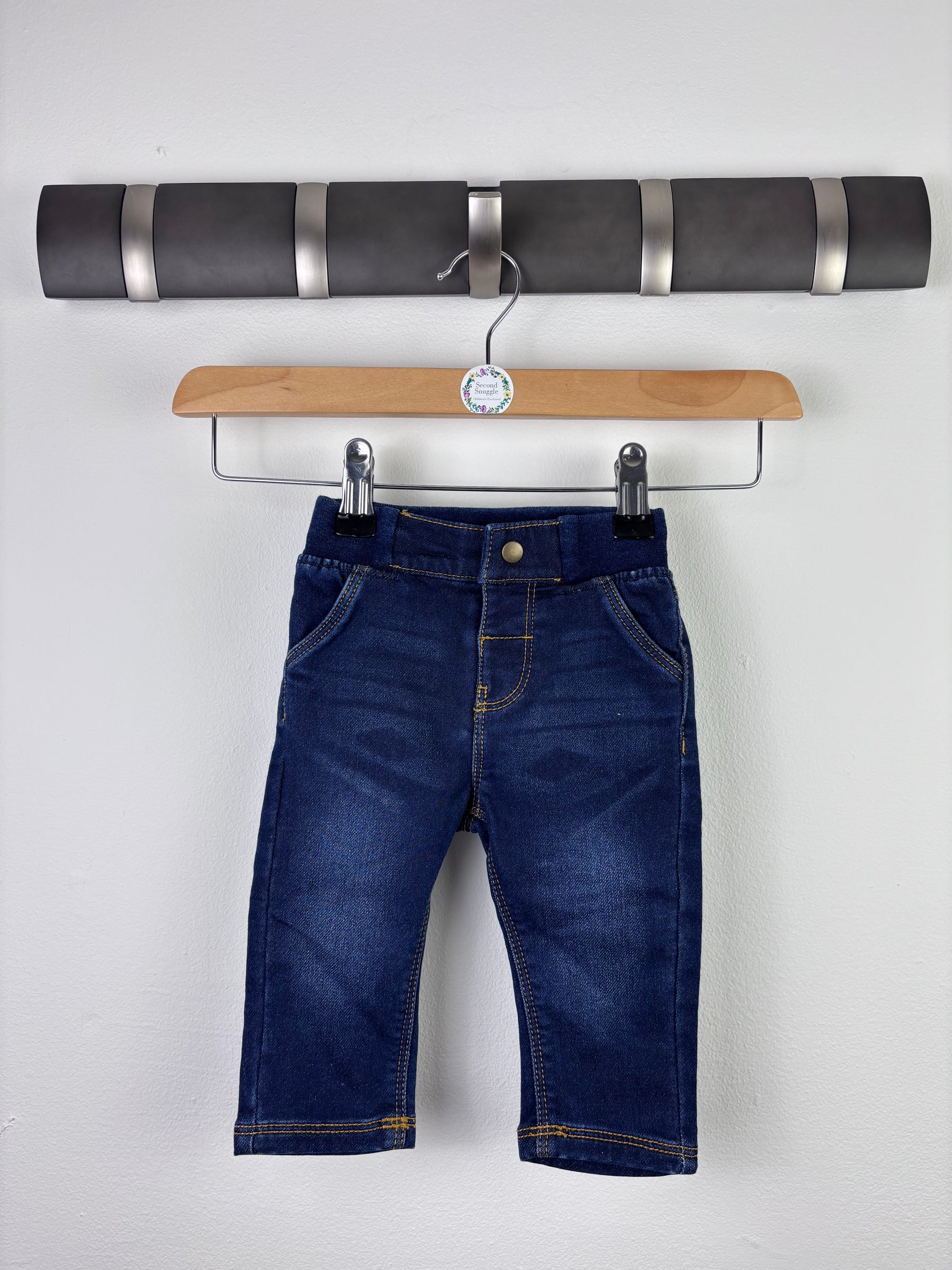 These Marks & Spencer dark wash jeans are a smart and practical option for little ones. Designed with a soft waistband and easy fit, they offer comfort while still looking stylish. The classic denim look makes them easy to pair with tops, jumpers, or cardigans for everyday outfits. In very good condition with minimal wear. A great basic piece for baby wardrobes and ideal for second-hand and preloved clothing collections focused on comfort and durability.