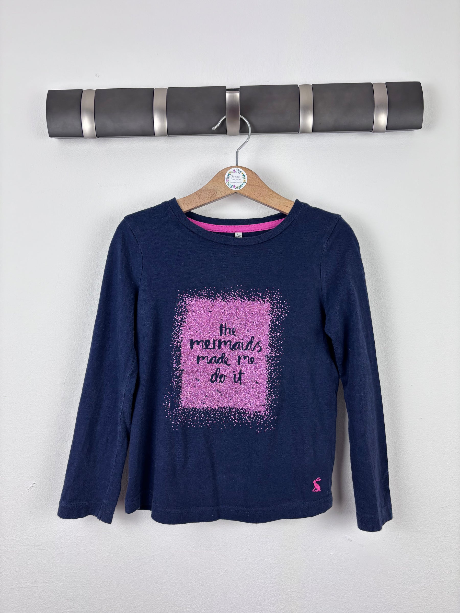 This Joules top is navy with a bright pink square design and the words the mermaids made me do it on the front. The fabric is soft and comfy which makes it great for everyday wear. It has long sleeves and a relaxed fit that works well for playtime. It is in very good condition with no marks that I can see and the colours look bright. This top is ideal for children who love fun designs. It is a lovely second hand and preloved kids fashion piece from Joules.