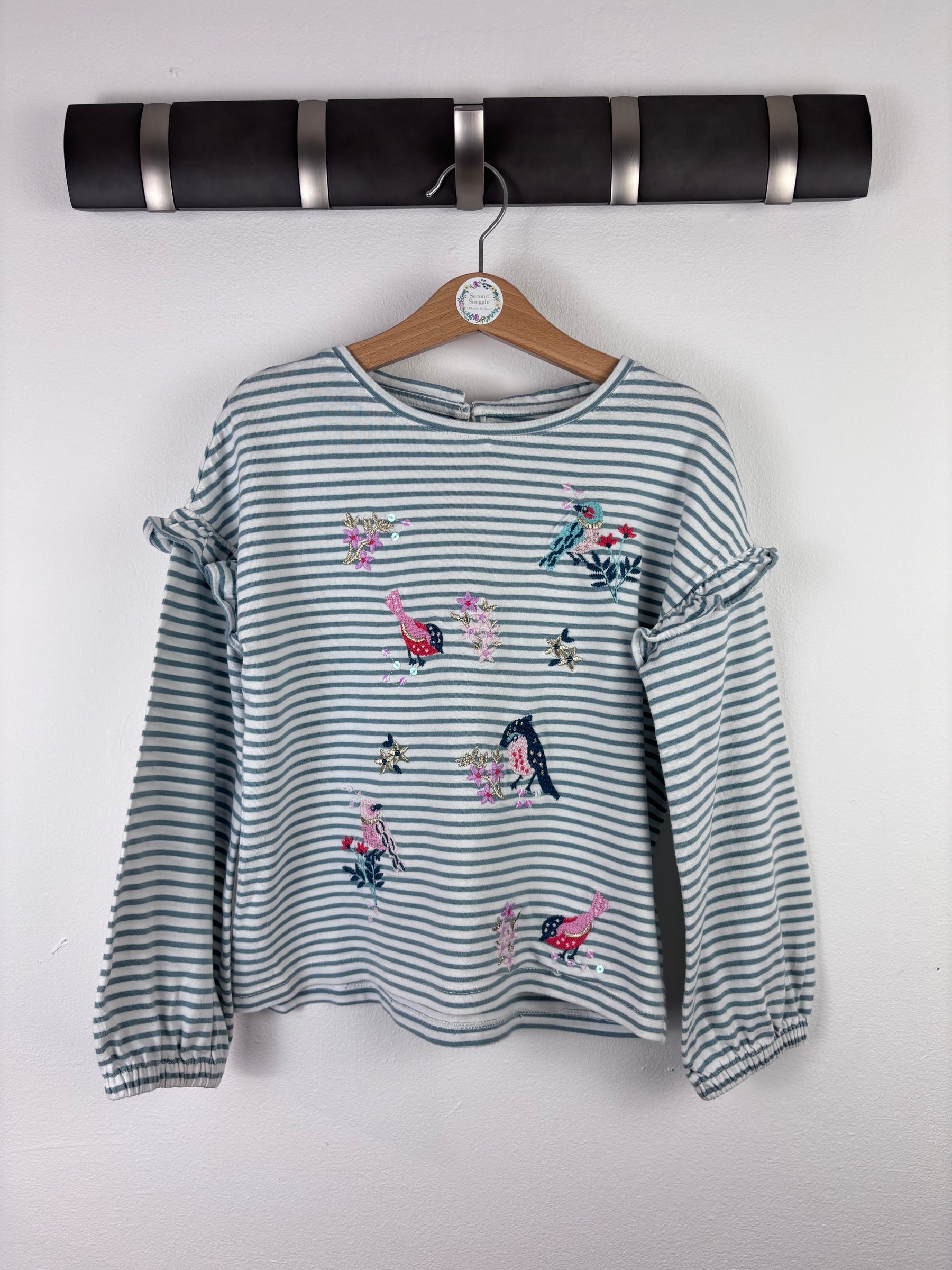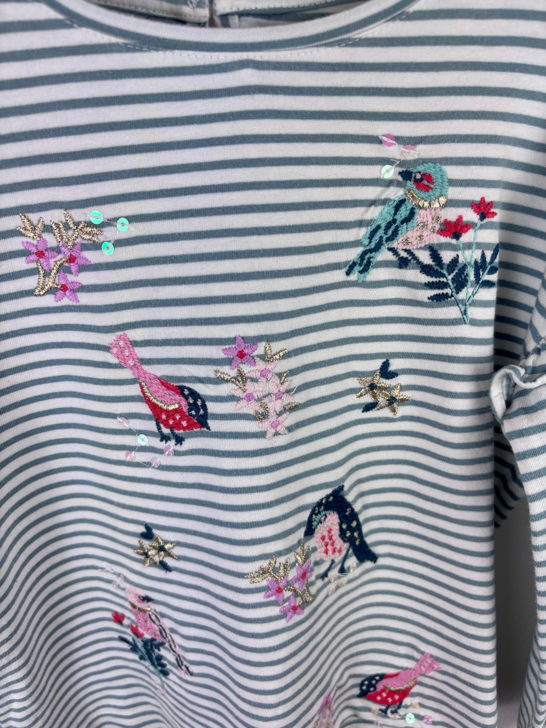 A pretty striped long-sleeve top from John Lewis featuring embroidered birds and floral details. Made from soft cotton and in very good condition, it’s perfect for comfortable everyday wear with jeans, skirts, or leggings. The subtle ruffle on the sleeves adds a charming touch. Known for quality children’s fashion, John Lewis pieces are made to last and be loved again. This preloved top is a beautiful example of sustainable style, offering great quality and a timeless design that feels as good as new.