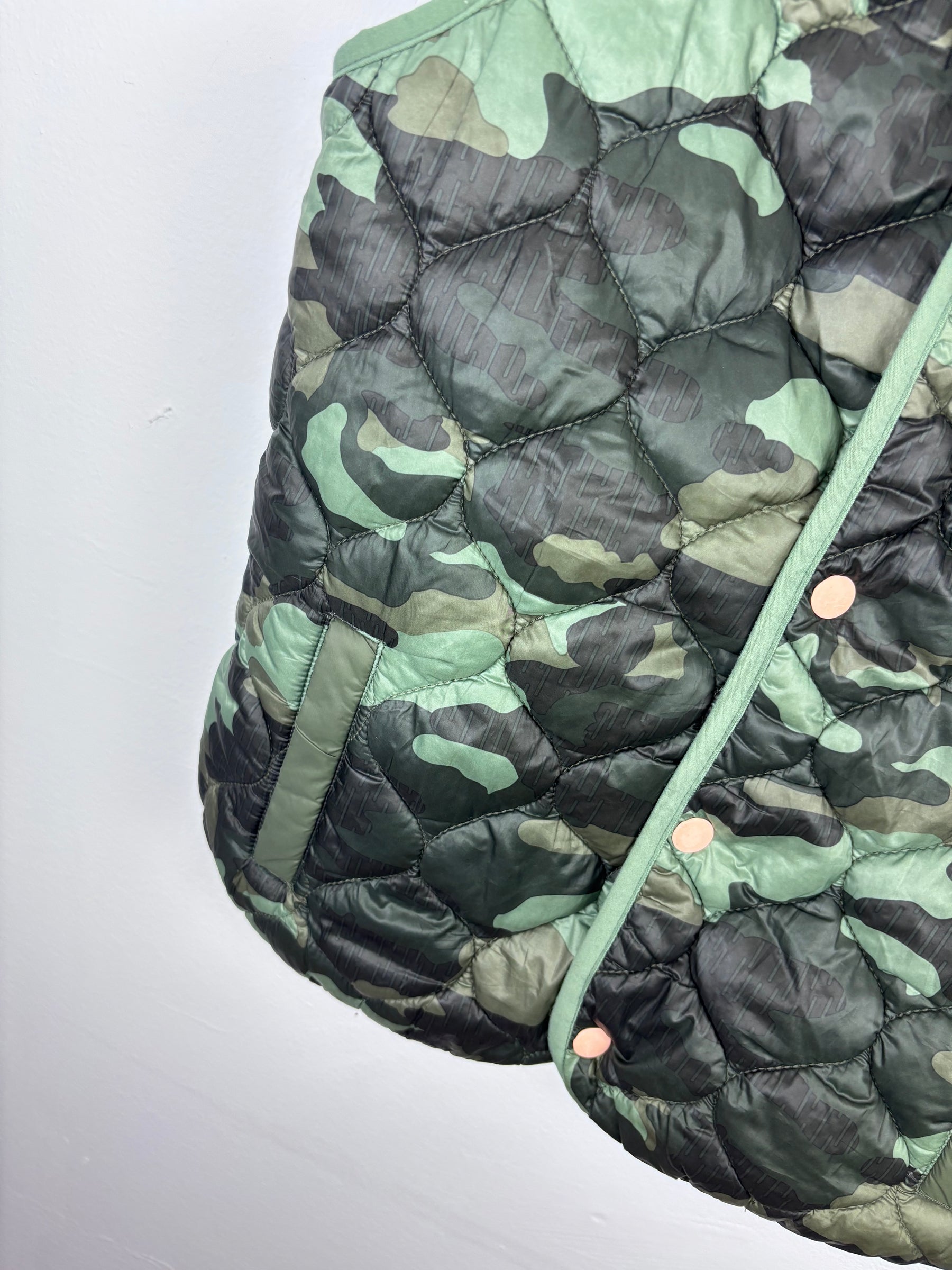 This M&S camo print gilet is brand new without tags and ready for adventures. The quilted design provides lightweight warmth, and the popper fastening makes it easy to wear over jumpers or hoodies. Finished with soft green trims and handy pockets, it’s a practical and versatile piece for layering. Perfect for days outdoors or casual weekends. This second hand find has never been worn, offering brand-new quality at a preloved price. A brilliant mix of comfort, style and functionality.