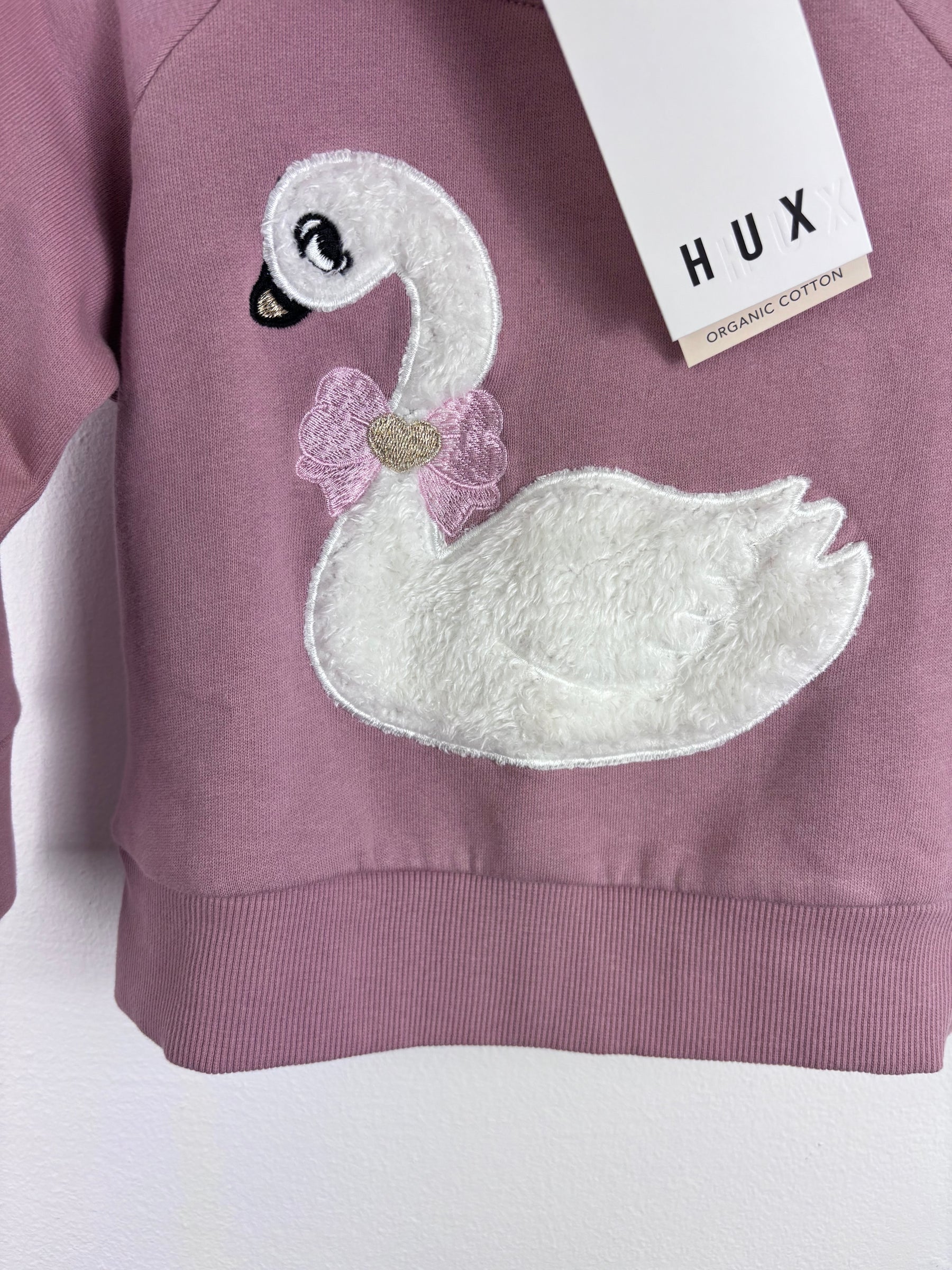 This Hux sweatshirt is made from organic cotton in a dusty pink shade with a big white swan on the front. The swan has fluffy detail with a bow and a gold heart, giving it a fun and cosy feel. The jumper has ribbed cuffs and hem for a snug fit. It is new with tags and has never been worn. Perfect for a baby wardrobe, this piece is part of children’s fashion that mixes comfort and style. A great sustainable new find alongside preloved clothes.