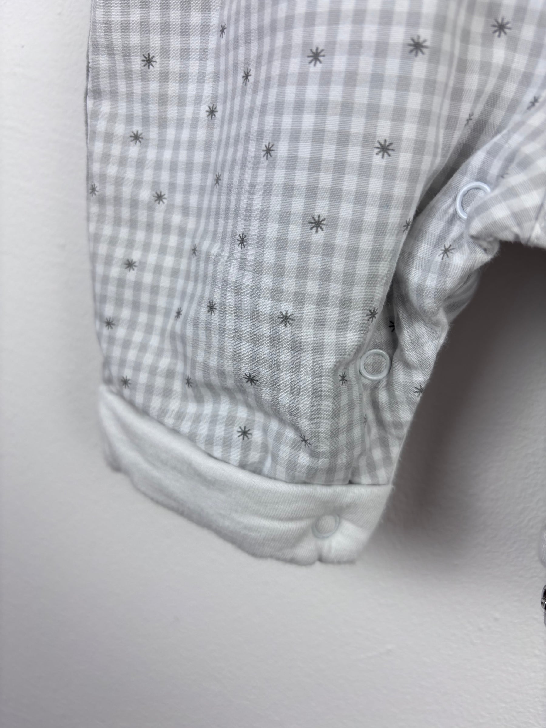 These Mothercare dungarees in size New Baby are in very good condition and feel soft and gentle for everyday wear. The grey gingham fabric is finished with a small star print and easy popper fastenings at the shoulders and legs for quick changes. This piece is ideal for layering over a vest and works well for daytime or nap time. It is a great second hand option for parents wanting quality baby clothing without buying new. This preloved item suits babies, children, and families shopping sustainably while still choosing trusted brands.