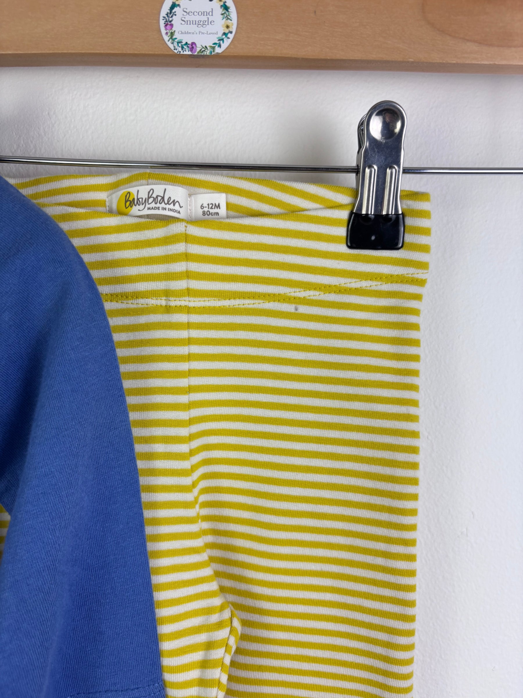 This Baby Boden outfit set includes a long sleeve blue top with a colourful flower jug applique and matching yellow and white striped leggings. The top is made from soft cotton and feels cosy for cooler days, while the leggings have stretch for easy movement. An elasticated waistband helps with quick dressing and comfort. This set is new without tags and unworn. A bright and cheerful choice for baby fashion that works well for kids and children’s clothing collections including second-hand and preloved styles.