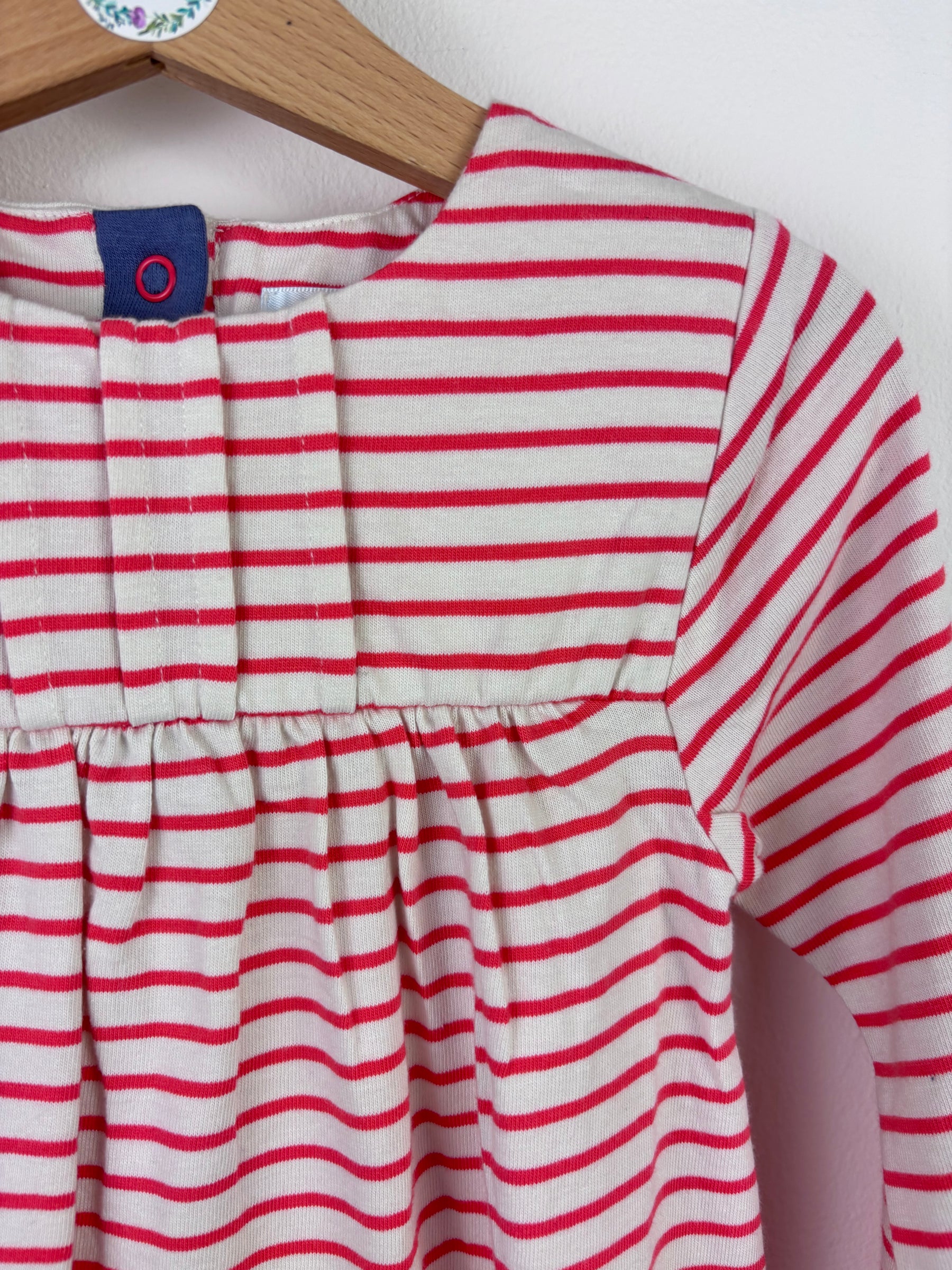 Soft red and cream striped long sleeve dress with a gently gathered waist and pleated chest panel detail. Designed with elasticated cuffs for a comfortable fit and easy pull on style. Made from soft cotton jersey fabric, perfect for layering in cooler weather or wearing on its own in milder seasons. In new without tags condition. A classic and versatile wardrobe staple.