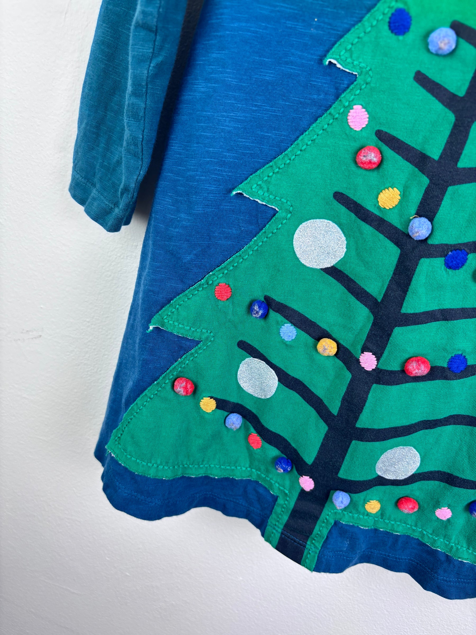 Blue long sleeve top from Boden featuring a large Christmas tree appliqué with colourful pom-pom style decorations and a glitter star. The soft cotton fabric makes it a fun and wearable piece of kids clothing.