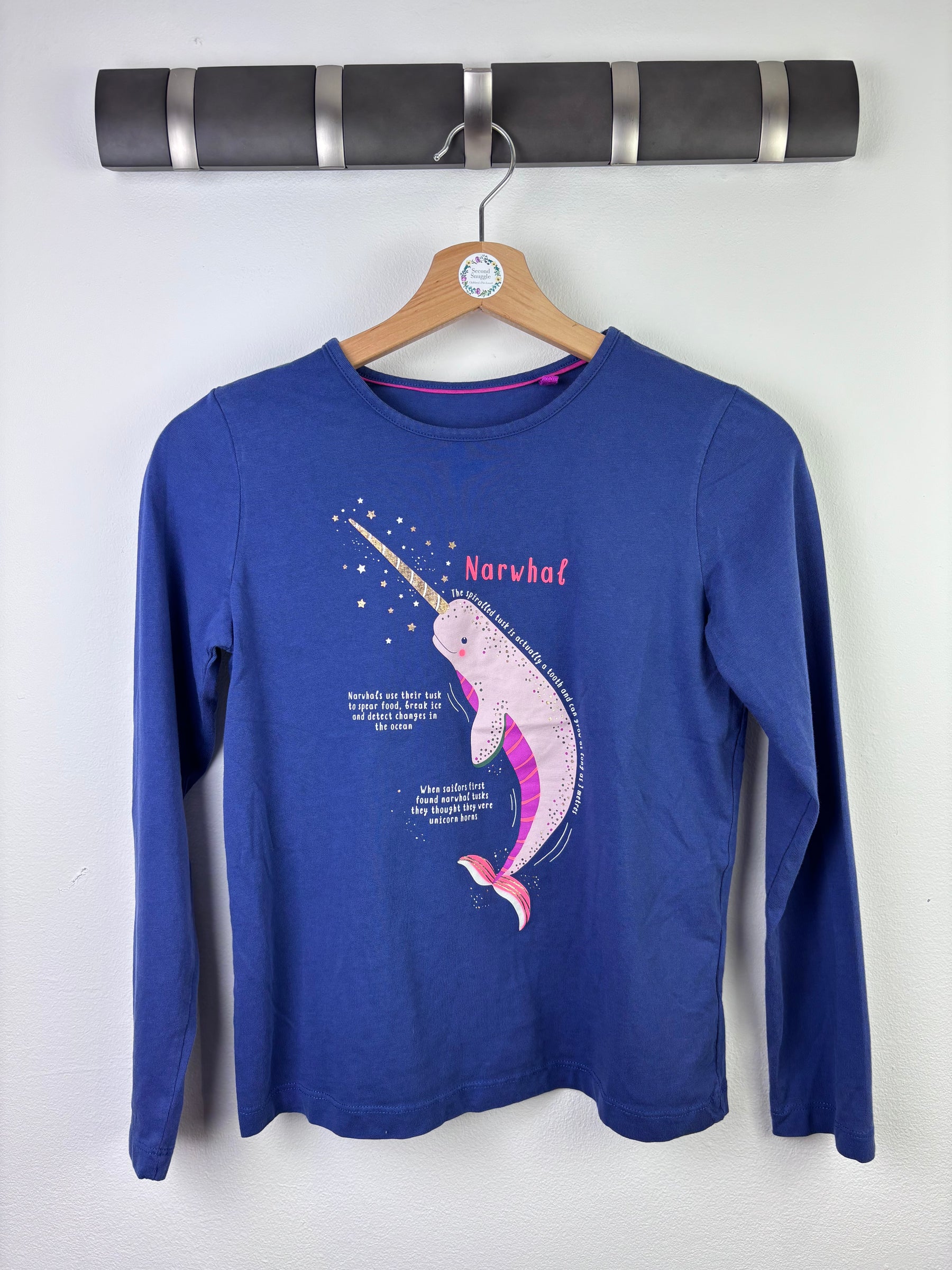 This blue long sleeve top from Boden features a detailed narwhal print with stars and fun facts printed around it. The design feels playful but still easy to wear, perfect for school or weekends. The fit is relaxed and comfy, and the fabric still feels smooth. The colours remain bright and clear. Condition is very good with gentle signs of wear only. This is a second hand item that has been looked after well. A preloved Boden top that fits nicely into kids fashion for older children and teens.