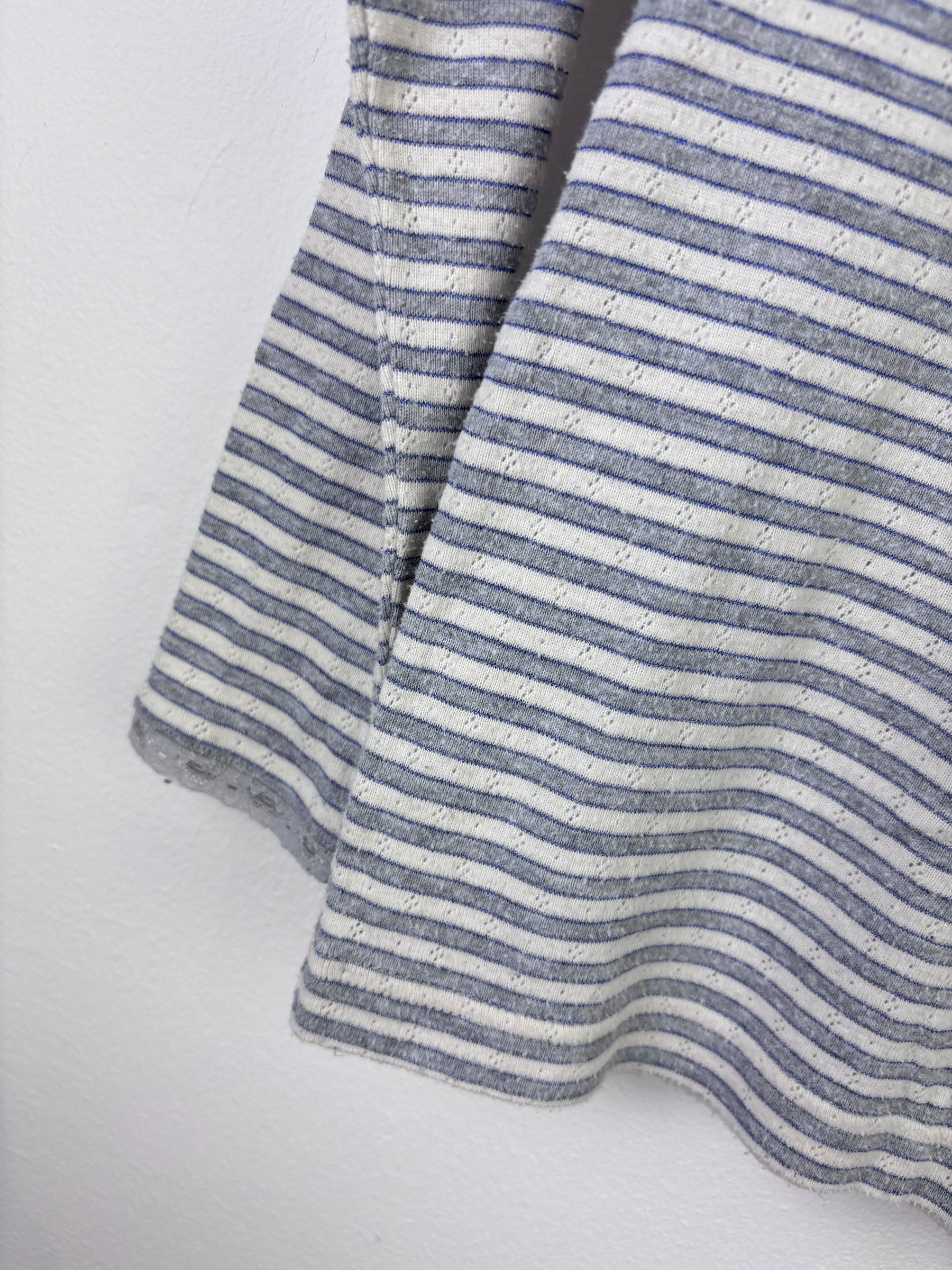 This Boden long sleeve top comes in a classic grey and white stripe design, offering a timeless and easy-to-style look. Made from soft cotton, it is comfortable for all-day wear and ideal for school or casual outfits. The relaxed fit and simple neckline make it great for layering under jumpers or jackets. In good condition with visible but light wear. A versatile staple piece that fits well into everyday children’s wardrobes and preloved clothing collections.