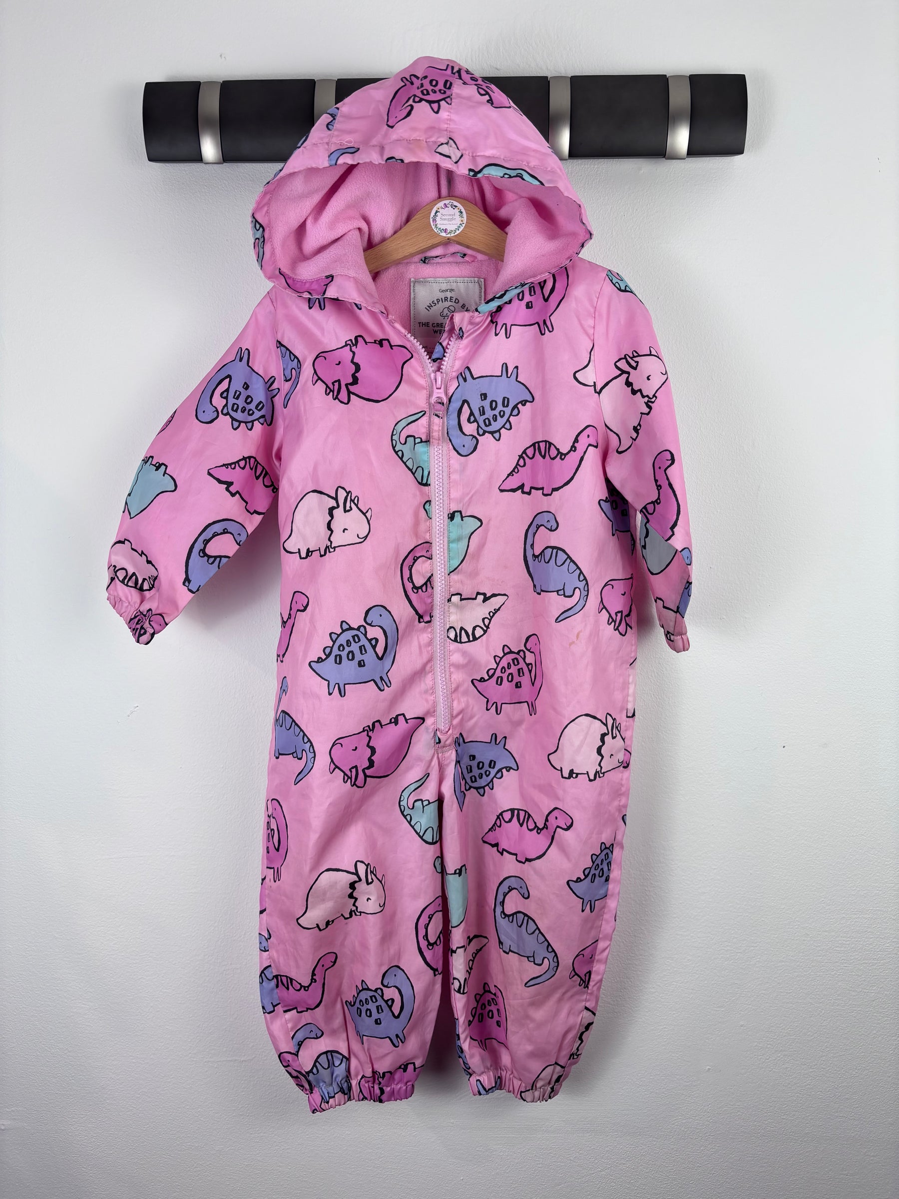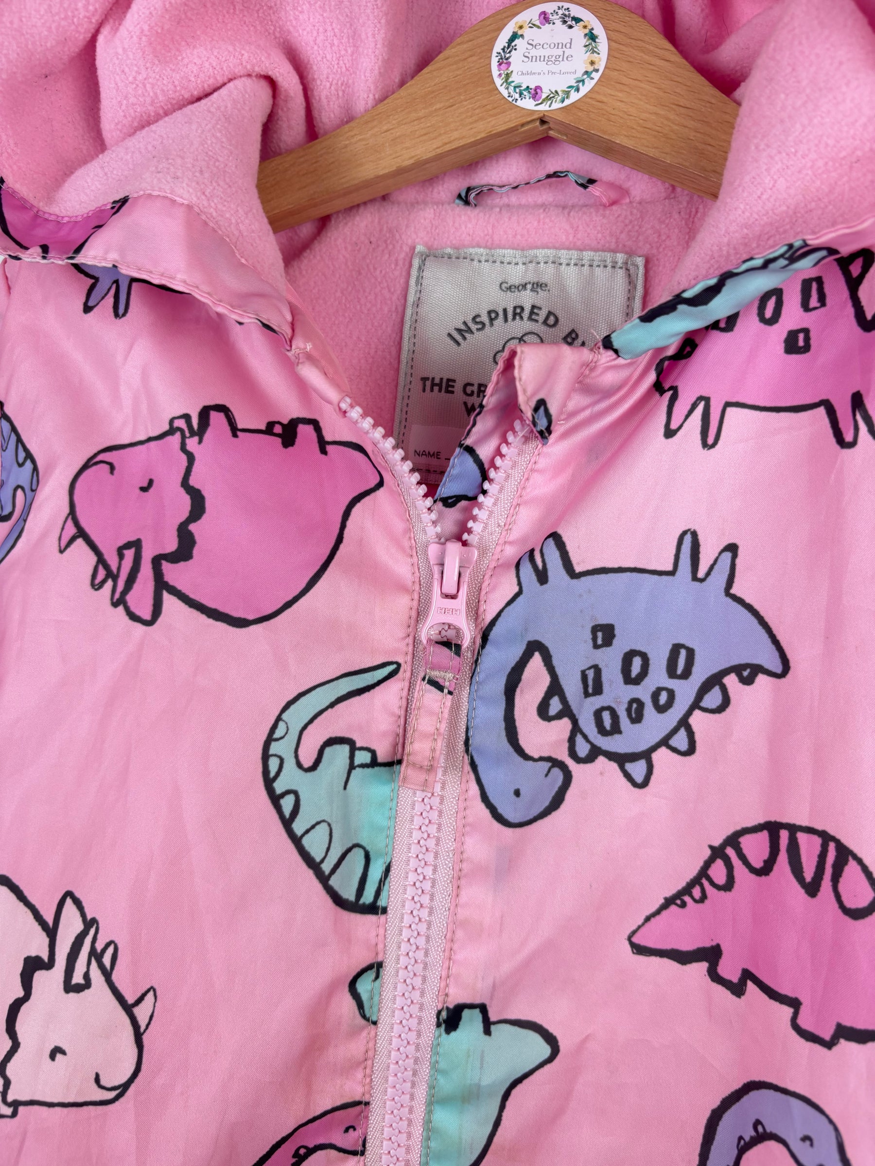This George snowsuit in size 12-18 months is in good condition. It features a fun pink dinosaur print with a cosy fleece lining and a hood for extra warmth. The full zip front makes dressing easy while elasticated cuffs keep little ones snug. Perfect for cold or wet days, this preloved snowsuit is a cheerful second hand piece that combines comfort and playfulness. Ideal for keeping warm on winter walks or outdoor adventures while still looking adorable and feeling comfortable.