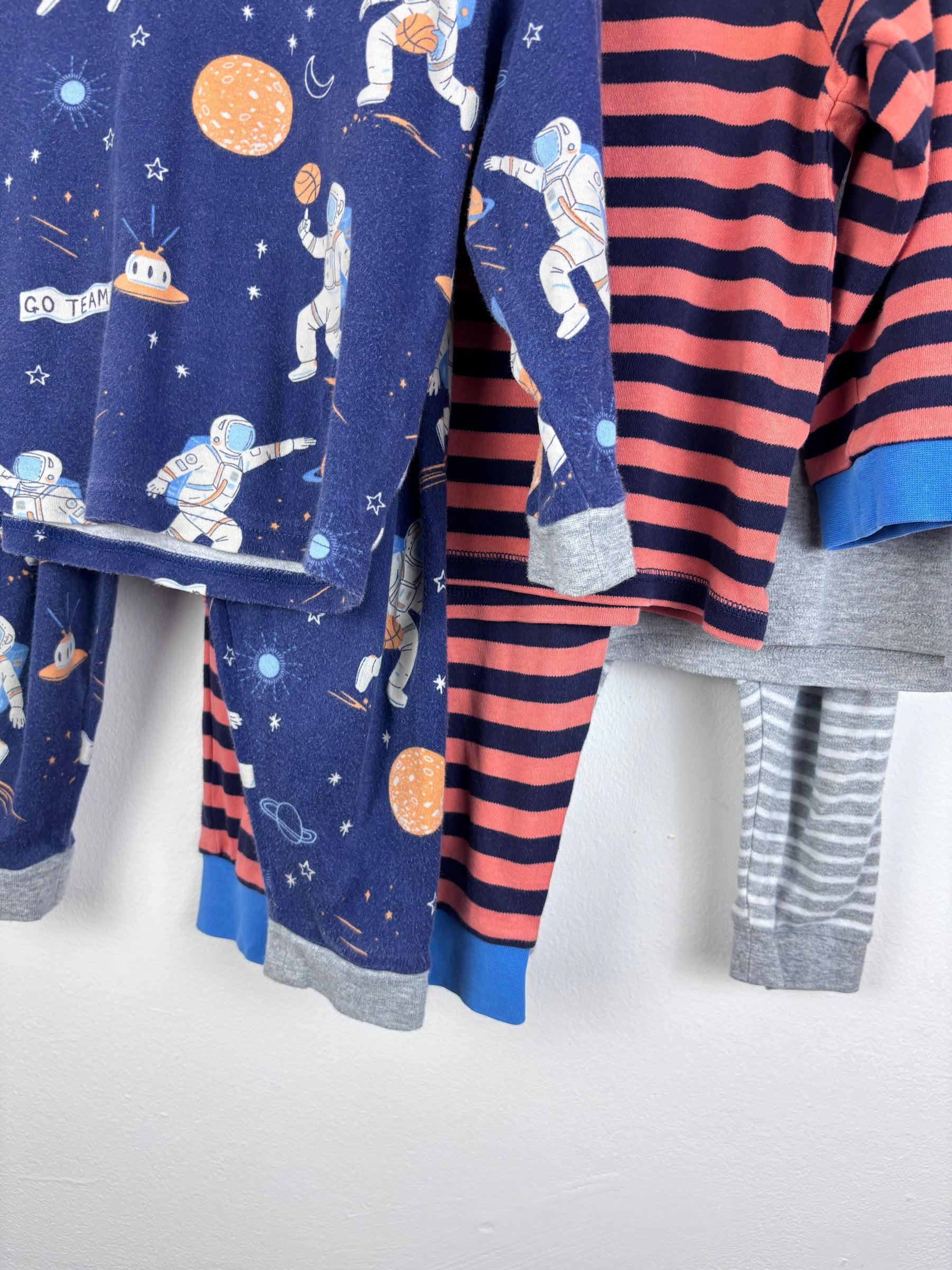 This John Lewis bundle includes three long sleeve pyjama sets featuring playful prints that are great for bedtime routines. Each set includes a soft long sleeve top and matching trousers designed for comfort and easy movement. They are in good condition with light signs of wear consistent with gentle use. The fabric remains soft and suitable for regular washing. This second hand pyjama bundle offers excellent value for growing children. These preloved pyjamas are a practical choice for everyday sleepwear and relaxed evenings at home.