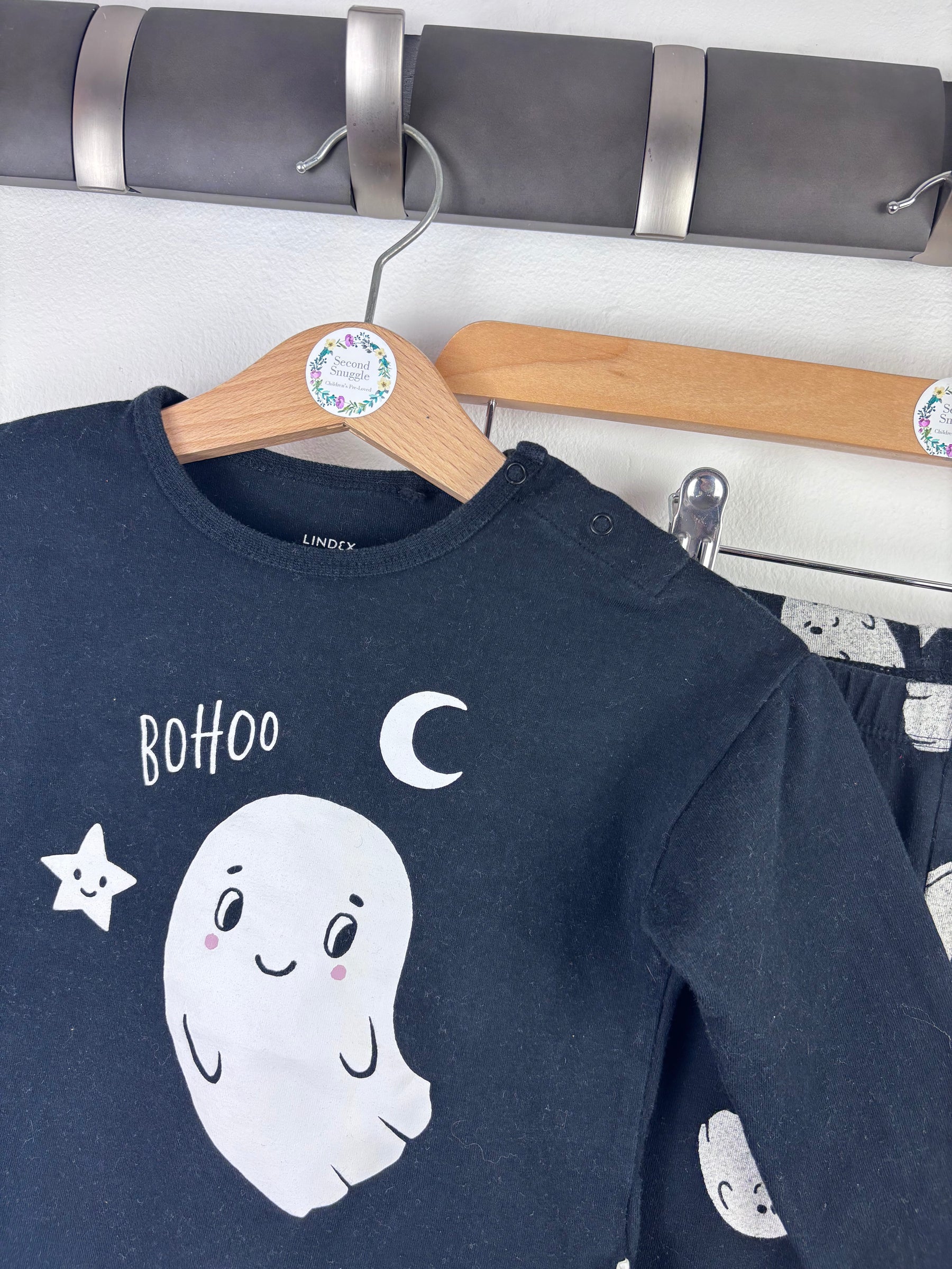 This adorable Lindex ghost set includes a long sleeve top and matching leggings in black cotton with a friendly ghost and star print. Perfect for Halloween or everyday wear, the fabric is soft and stretchy for comfort. Easy to pull on and off, it’s ideal for little ones on the move. This preloved second hand baby outfit is a fun and sustainable choice for autumn days, combining comfort, quality and playful style for babies who love to explore.