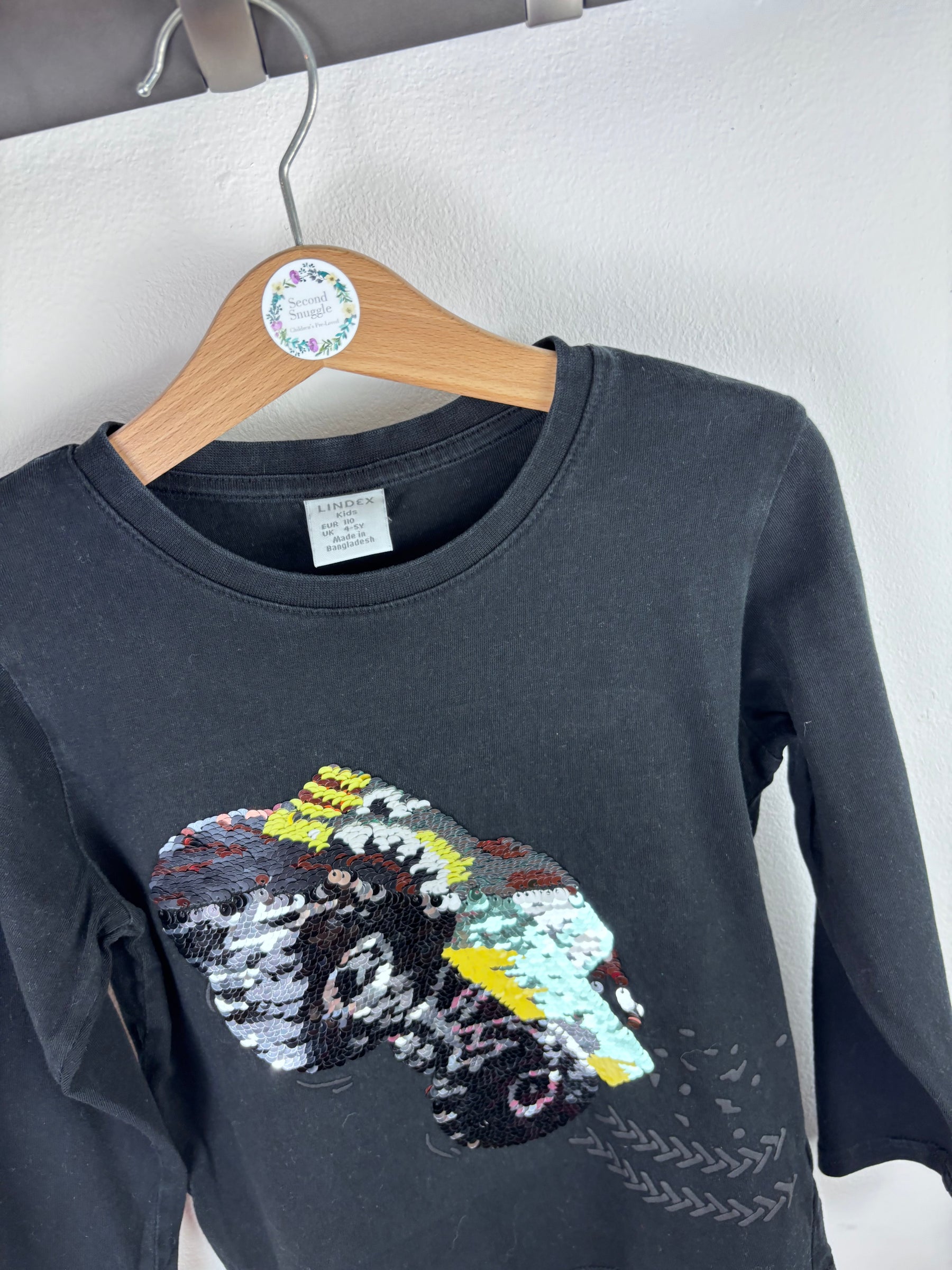 This Lindex top in size 4-5 years is in excellent condition. Made from soft black cotton, it features a sequin monster truck design that changes colour when brushed. Fun and eye-catching, it’s perfect for children who love vehicles and play. This preloved top is a brilliant second hand find that brings a little sparkle to everyday wear. Great for pairing with jeans or joggers, it’s comfy, cool and easy to love.