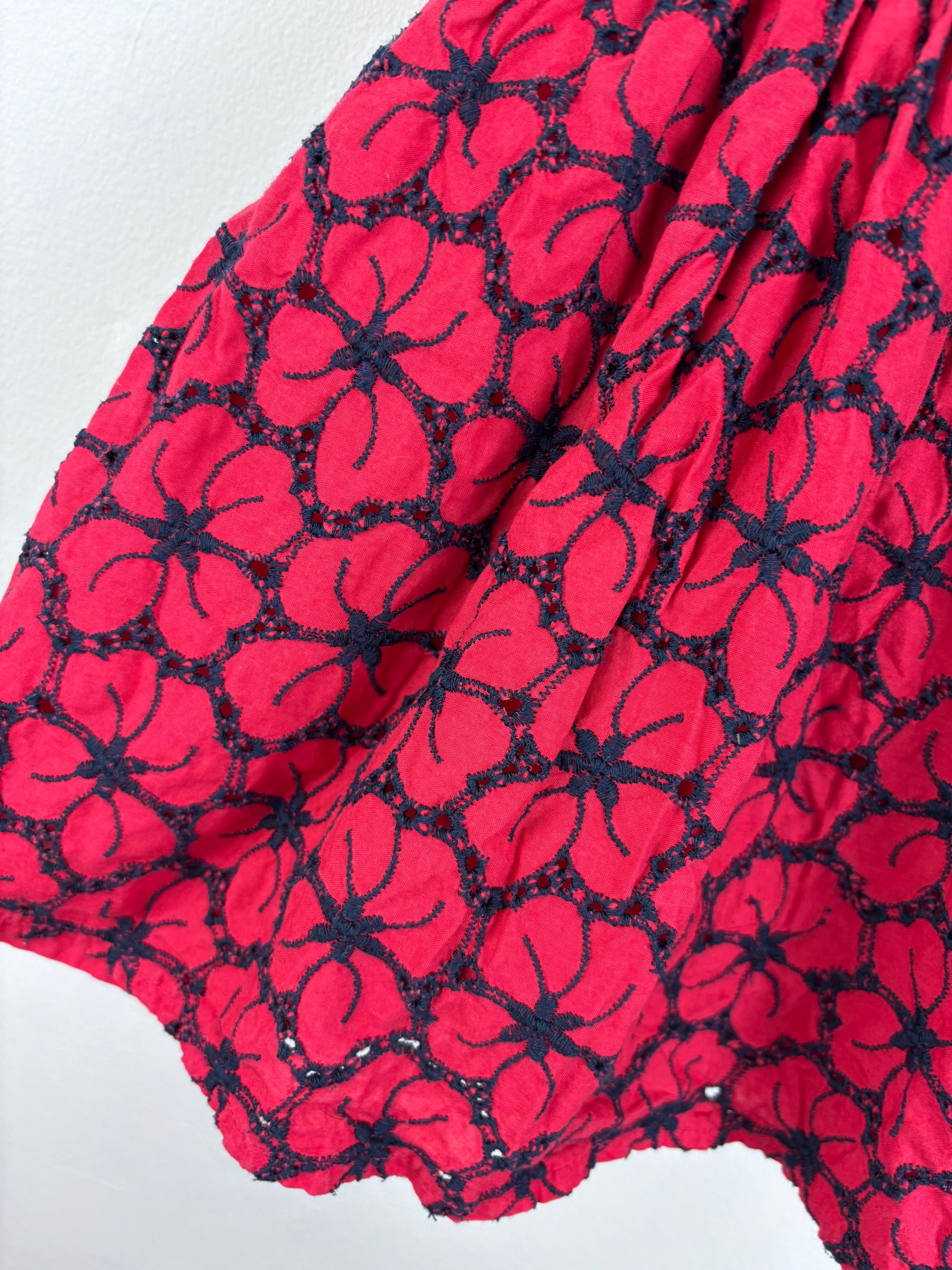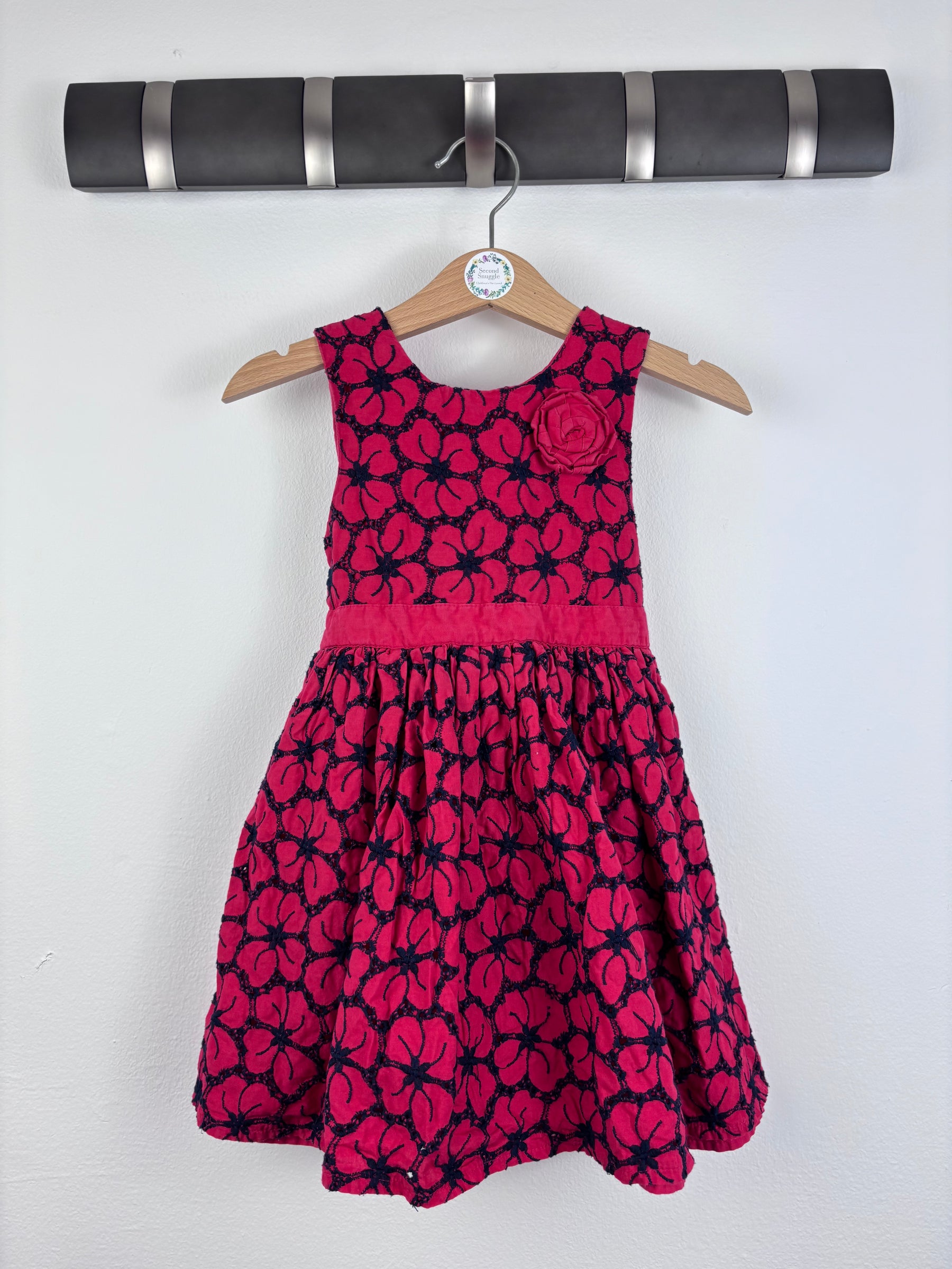 This Matalan dress is a bright pink with navy floral lace overlay and a fabric flower at the waist. It has a sleeveless design with a full skirt, making it perfect for special occasions. The fabric is soft but holds its shape for a lovely look. Condition is good with only light signs of wear. Choosing second hand children’s fashion like this preloved party dress is a great way to find stylish outfits while being sustainable.