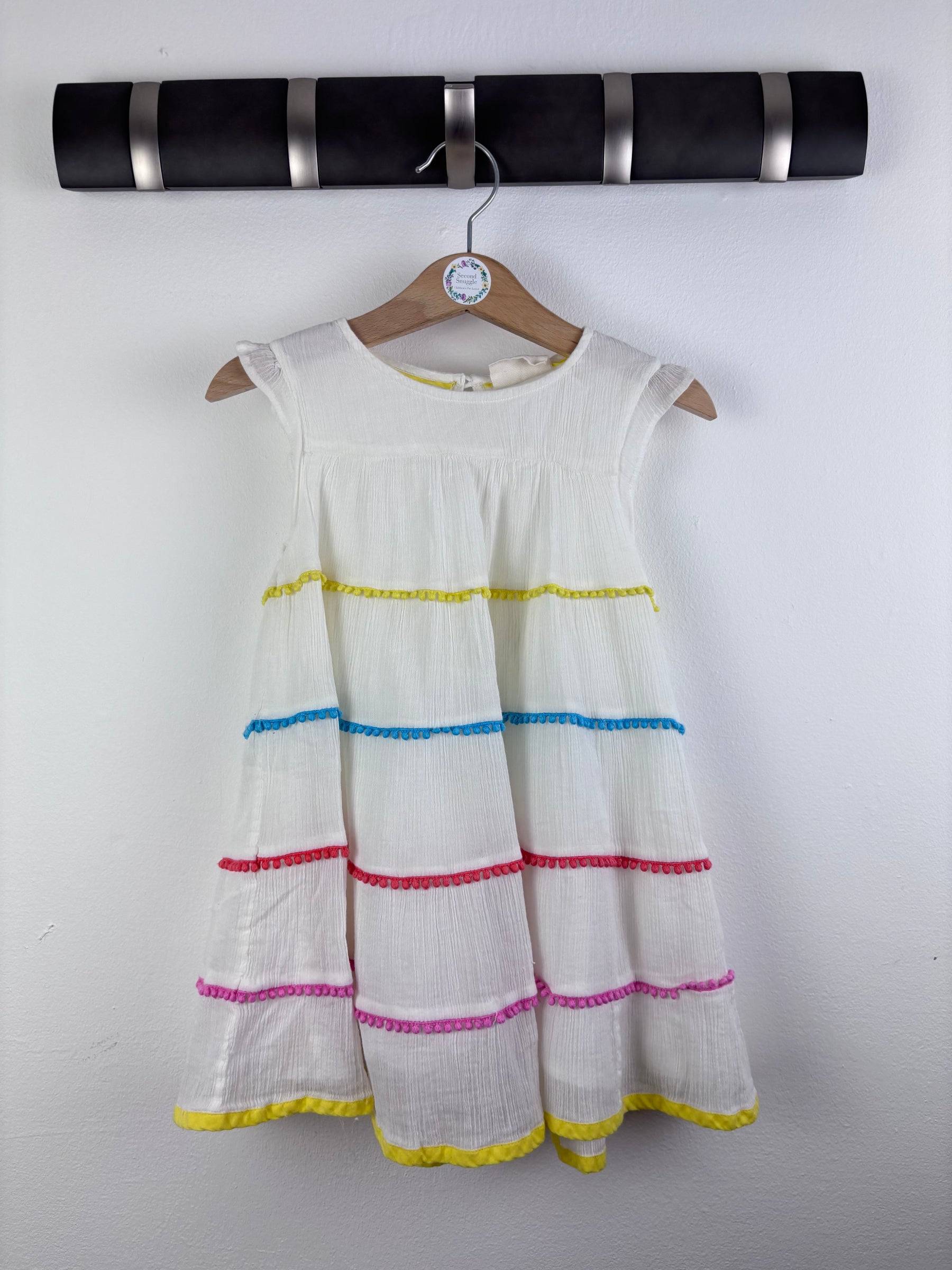 Lovely white sleeveless dress from Mini Boden featuring tiered layers with colourful pom pom trim detailing. Made from lightweight fabric, perfect for warm weather, holidays, or special occasions. The relaxed fit allows easy movement while still looking stylish and fun. Size 2–3 years. In very good condition with minimal signs of wear. A bright and cheerful piece that adds a playful touch to any summer wardrobe.