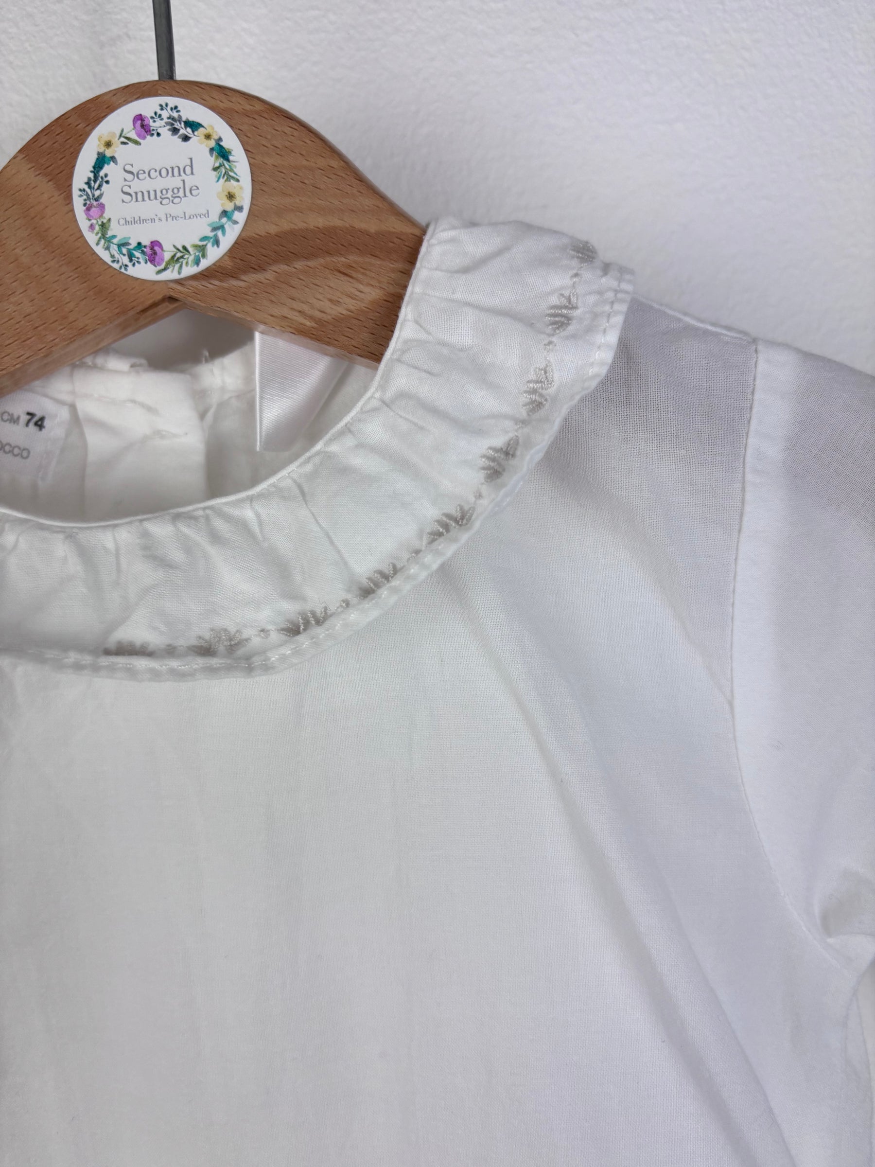 This Zara bodysuit in size 6-9 months is in very good condition and ideal for smart occasions or layering. It has a soft white design with a ruffle collar and long sleeves, giving a dressed-up look while still being comfortable for little ones. With poppers underneath for easy changing, it’s a practical choice too. A lovely piece to wear under dresses, dungarees or on its own. Preloved baby clothing like this offers style and quality at a fraction of the price. A sweet and timeless addition to a baby’s wardrobe.